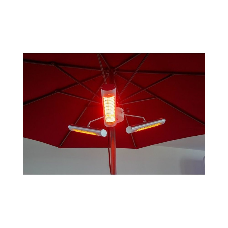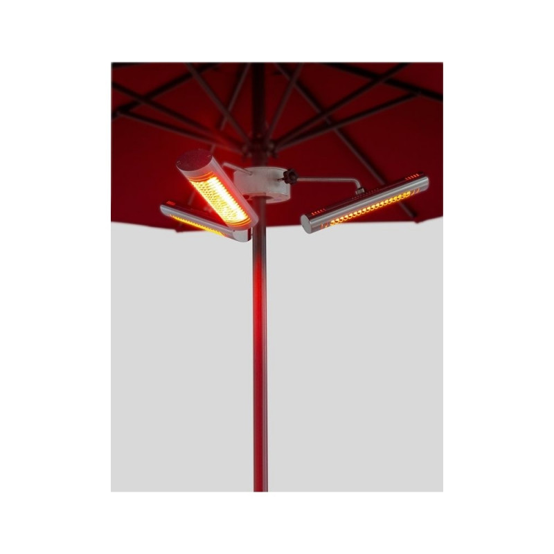 ULG heating element infrared heater – strong heat effect, cozy orange light tone! - ultra low glare. Pendant-style infrared heater mounted to a post is suitable for outdoor use on home terraces, verandas, restaurants, and café terraces above tables. Ideal for use under large sunshades or umbrellas. All three heaters are individually adjustable and can be rotated in any direction. They also each have a remote control for independent on/off operation. Suitable for indoor use as well.
