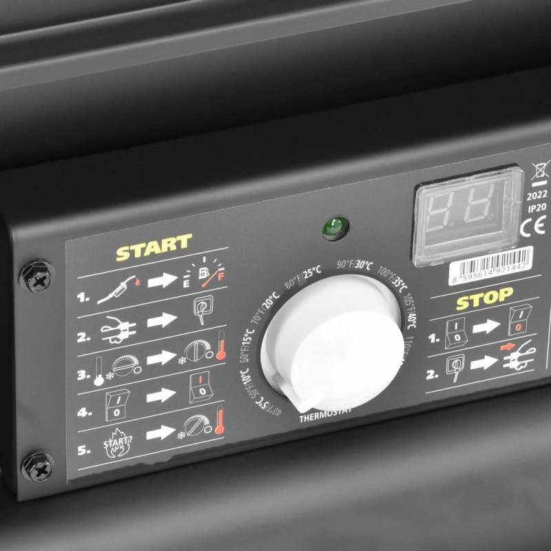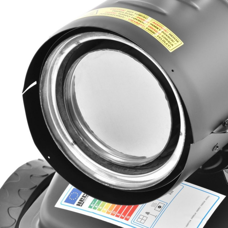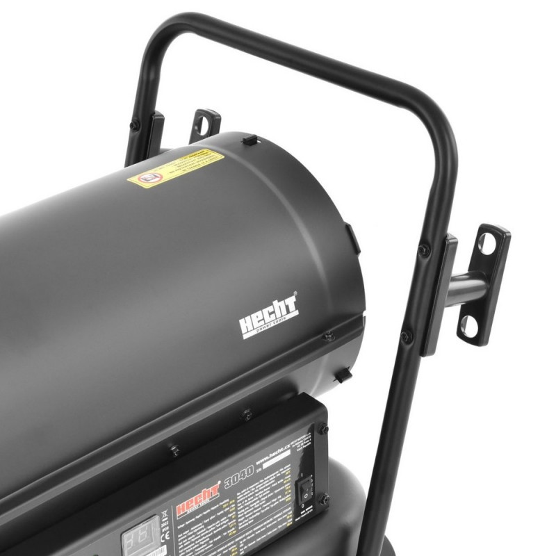 Indirect combustion diesel heater - flue gases through the chimney - heats with clean air! HECHT 3040 is an internal combustion blower, flue gases are safely passed through the chimney on top of the appliance and only clean and heated air is blown into the room. The blower must be positioned so that the flue gases leave the heated room, for example in front of open doors, etc.   Heating capacity 18 kW / 62,000 Btu. Diesel consumption 1.8 l / h. Power consumption 280 W. The electrical input required to control the fuel pump and fan is 280 W. Power supply 230 V / 50 Hz. Air flow 450 m3. The weight of the device without fuel is 25.1 kg.