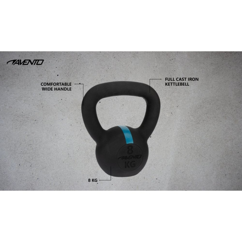 • full cast iron kettlebell • round ball with flat bottom and wide ergonomic handle • easy to clean and store • coloured ring and embedded weight indication • weight approx. 8 kg Brand Avento Colour Black/Silver grey (BLK)Warning: Last items in stock!