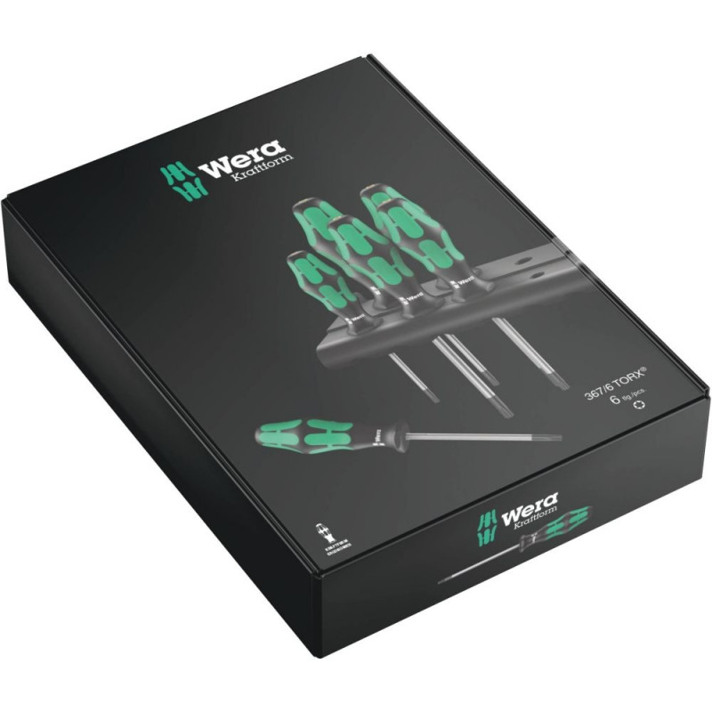 The 6-piece screwdriver set 367/6 for hexalobular internal screws is equipped with a multi-component Kraftform handle for fast and low-fatigue working. The hard gripping zones ensures high working speeds whereas soft zones ensure high torque transfer. The Wera Black Point tip and a complex hardening process ensure a long service life of the tip, enhanced corrosion protection and an exact fit. The Wera Black Point tip offers high corrosion protection and an exact fit.The "Take it easy" colour coding makes it easy to find the required tool according to profile and size. The anti-roll feature prevents any bothersome rolling away at the workplace.
