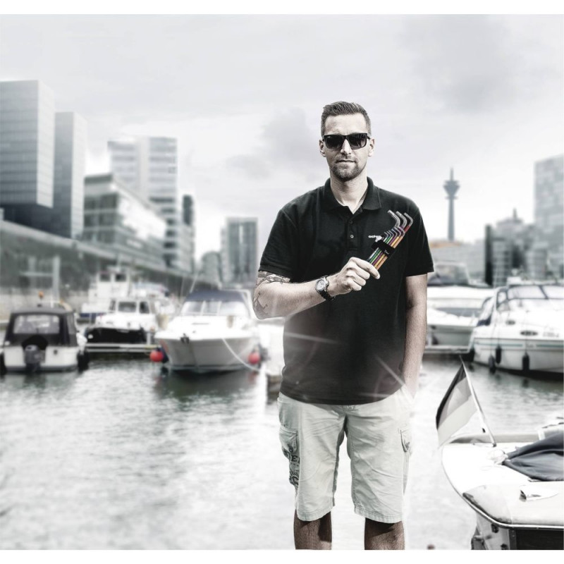 High quality L-key set for hexagonal socket screws in a practical clip fastener out of wear-resistant material, enabling secure storage of the L-keys as well as simple removal. L-keys with Hex-Plus profile: offers a larger contact surface within the screw head. This reduces the notching effects to a minimum and almost completely eliminates the risk of destroying the screw recess. The ball-end on the long arm allows for reliable working even in difficult installation situations. The BlackLaser surface treatment provides outstanding surface protection, even against corrosion, and a long Service life. The tools are quickly to hand thanks to the laser-engraved and thereby wear-resistant size markings on the L-keys
