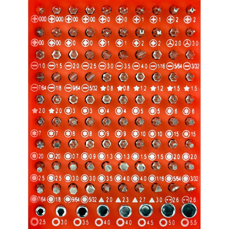 | Screwdrivers/bits sizes | Phillips: PH000, PH00, PH0, PH1, PH2 (2 pcs each) Pozi: PZ00, PZ0, PZ1, PZ2 (2 pcs each) Slot: 1.0, 1.5, 2.0, 2.5, 3.0, 3.5, 4.0 Slot: 1/16, 5/64, 3/32, 7/64, 1/8, 9/64, 5/32 Star: 0.8, 1.2, 1.5, 2.0 (2 pcs each) Torx: T3, T4, T5, T6, T7, T8, T9, T10, T15 |