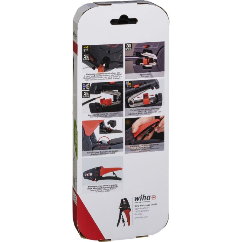 The automatic wire stripper from Wiha makes stripping easy. The cutting function allows you to cut cables to the appropriate length. The integrated hand guard on the cutting edge protects against injuries and the automatic closing function avoids accidentally damaging other cables in the harness. The pliers can strip cables from 0.03 - 16 mm². The adjustable length stop ensures precise work. The wire stripper also works very quietly. For large cable cross-sections of 6 mm² and more, there is a damper that you can insert into the pliers to reduce recoil and relieve the strain on your wrists. Spare blades and replacement aids are integrated in the handle for quick use. The wire stripper is space-saving and securely locked when you lock the handles. This is ideal for mobile use.