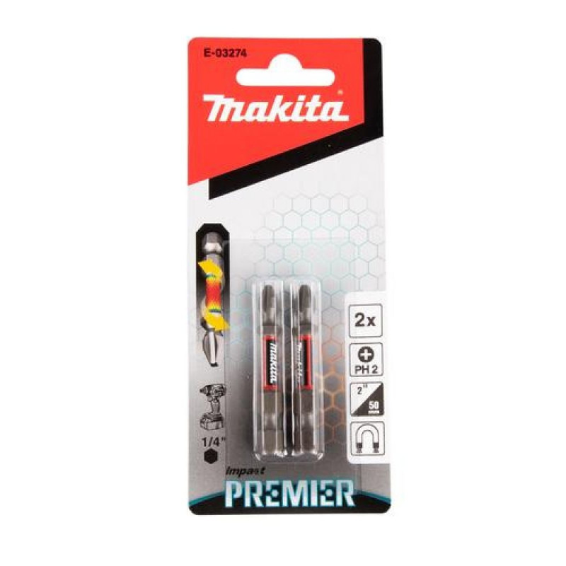 <br />Makita E-03274. Number of bits: 2 pc(s), Phillips screwdriver bits: PH 2, Security hex screwdriver bits (imperial): 1/4. Length: 50 mm, Package width: 60 mm, Package depth: 145 mmWarning: Last items in stock!