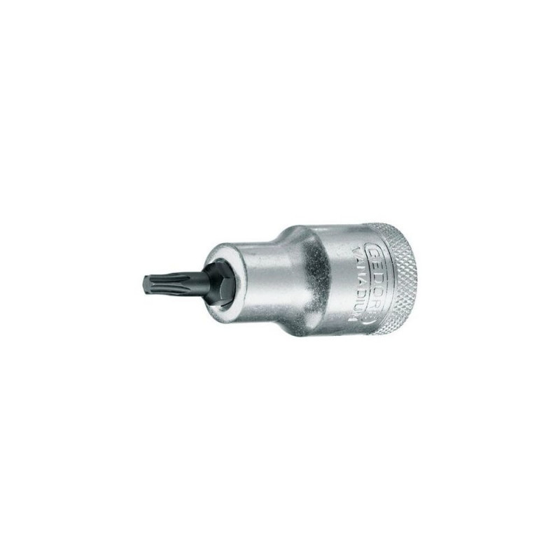 Square drive as per DIN 3120 - C 12.5, ISO 1174, with ball retaining groove. Hand-operated, knurled grip. Chrome-plated. With pressed-in pin in Gedore vanadium special steel, gun-metal finish. TORX® = reg. trademark of Acument Intellectual PropertiesProduct has been archived