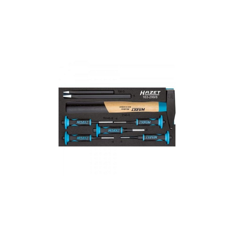 <br />HAZET 163-299/8. Product type: Drift punch set, Product colour: Black, Blue. Weight: 1.68 kg. Quantity per pack: 8 pc(s), Package width: 342 mm, Package depth: 172 mm. Country of origin: GermanyProduct has been archived