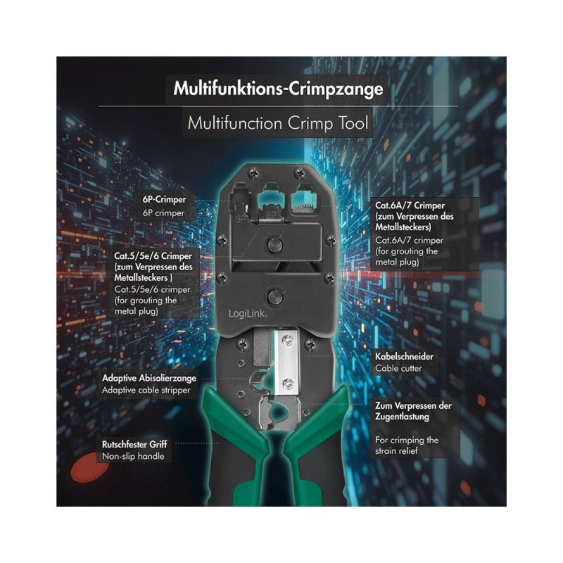 | Other features | Multifunctional Crimp Pliers for Phone & Network Suitable for CAT3, CAT5, CAT6, CAT6A and CAT7 Works with RJ45, RJ12, RJ11 and modular jacks Also suitable for RJ45 plugs with metal clip Suitable for network and telephone cables With cutting and stripping |