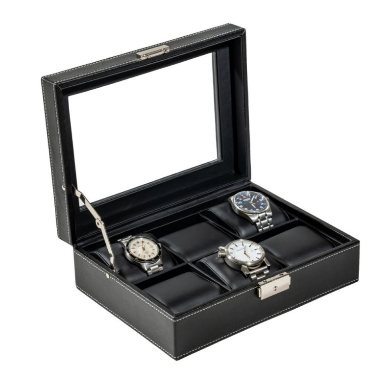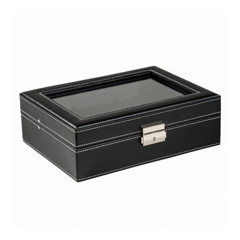 - Kvaliteetne, mustast kunstanahast katte ja dekoratiivsete õmblustega nägus kellakarp.