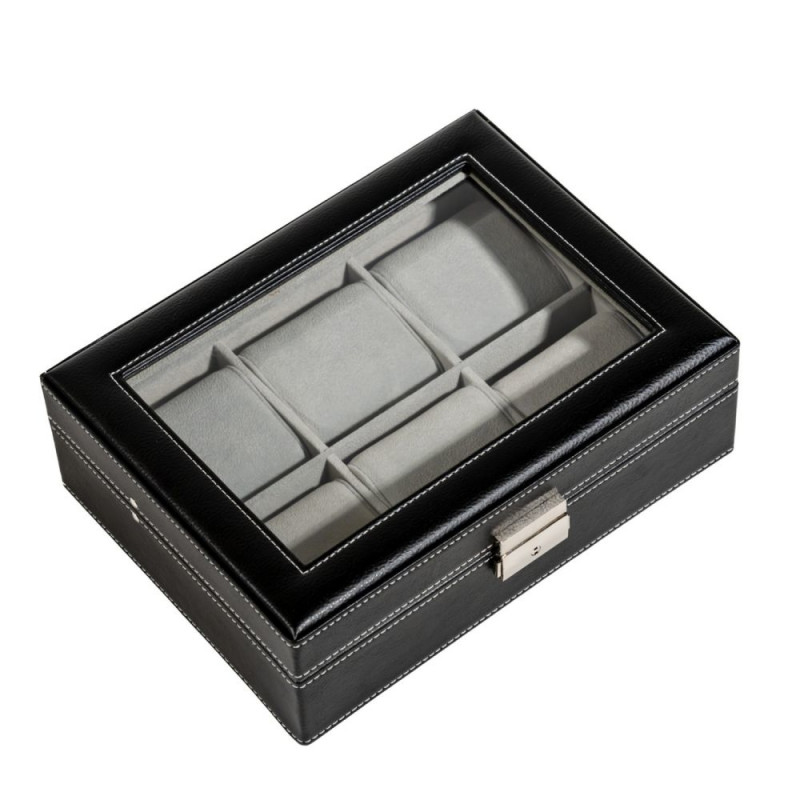- Kvaliteetne, mustast kunstanahast katte ja dekoratiivsete õmblustega nägus kellakarp.