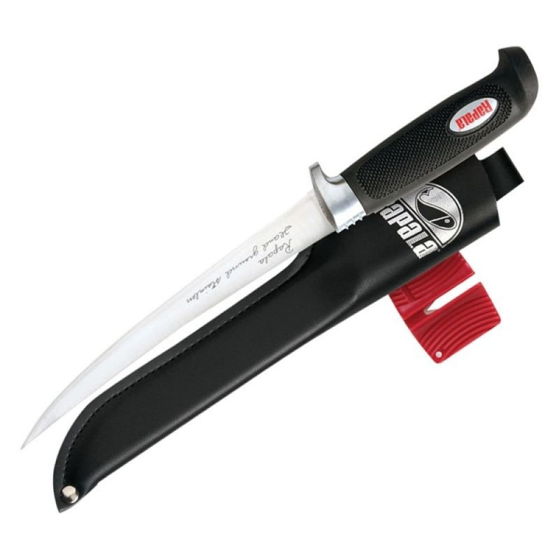 The famous Rapala flexible blade with a no-slip, soft grip handle for filleting comfort. Enlarged finger guard for added safety. Comes complete with coordinated black textured sheath. Includes single-stage sharpener