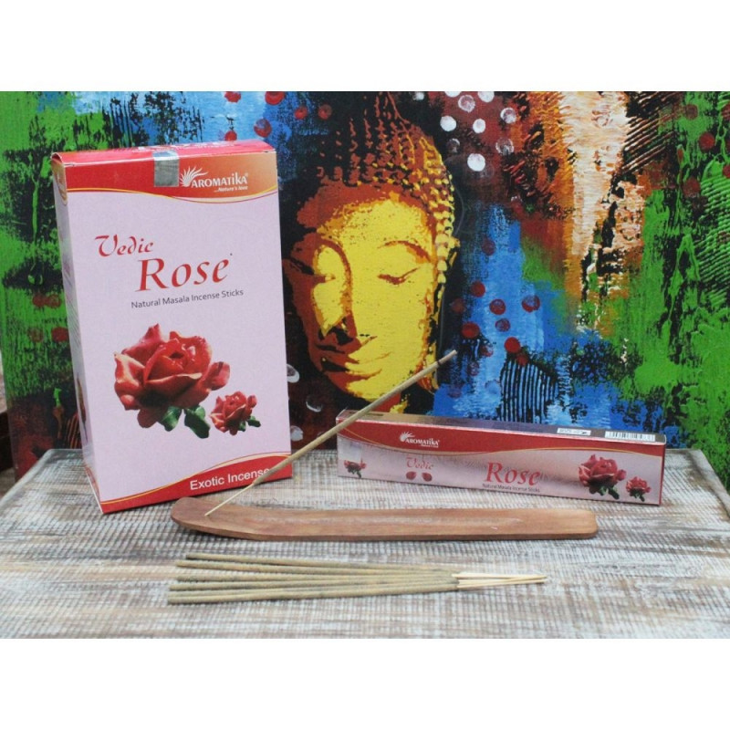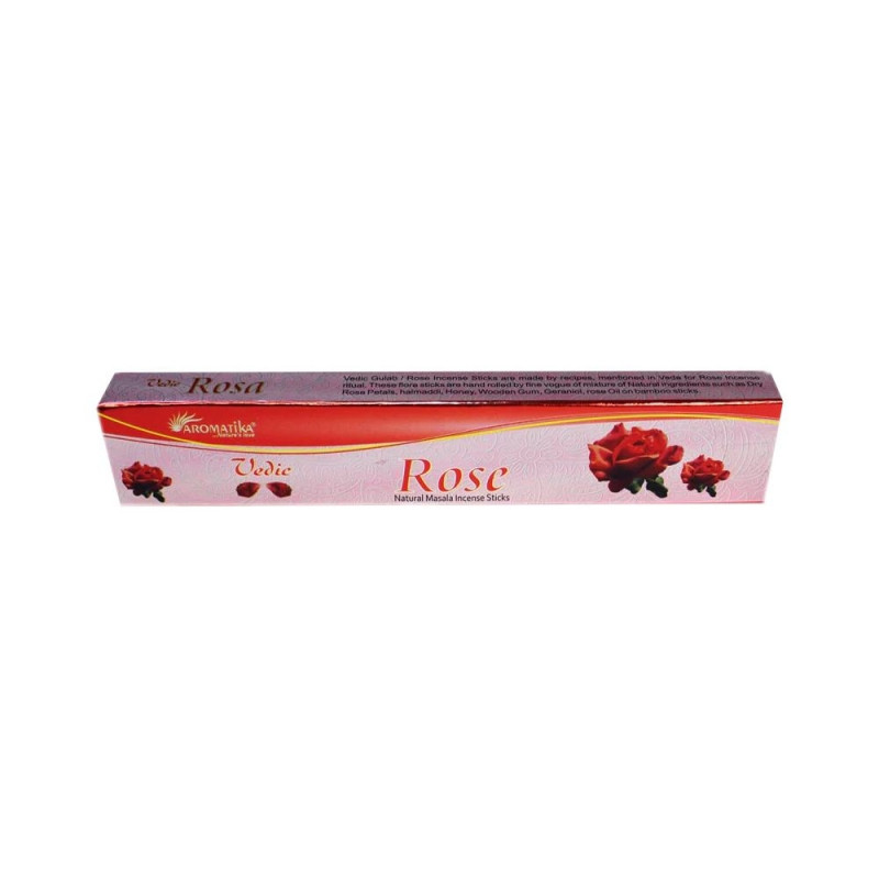 Vedic "Rose" incense sticks are hand-rolled masala incense made in Jaipur, India. Each pack weighs 15 g and burns for approximately 20 minutes.Warning: Last items in stock!