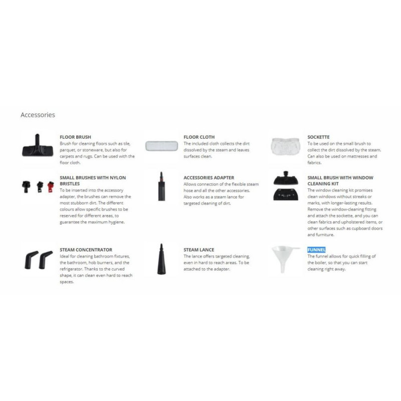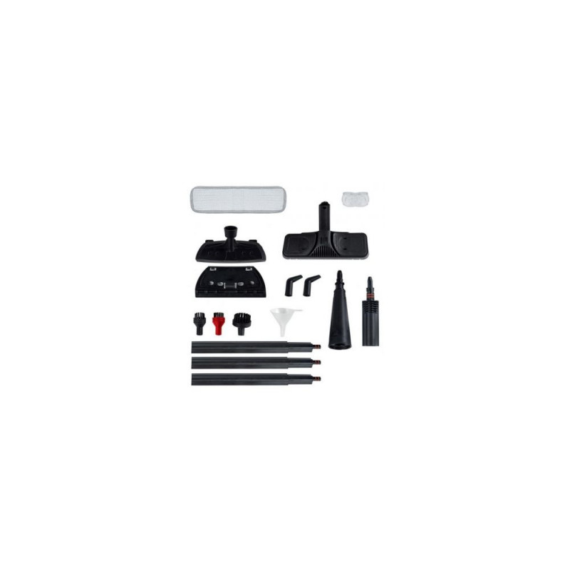 Tarvikud kaasa arvatud 12 included accessories: floor brush, floor cloth, sockette, small brushes with nylon bristles, accessories adapter, small brush with window cleaning kit, steam concentrator, steam lance, funnel