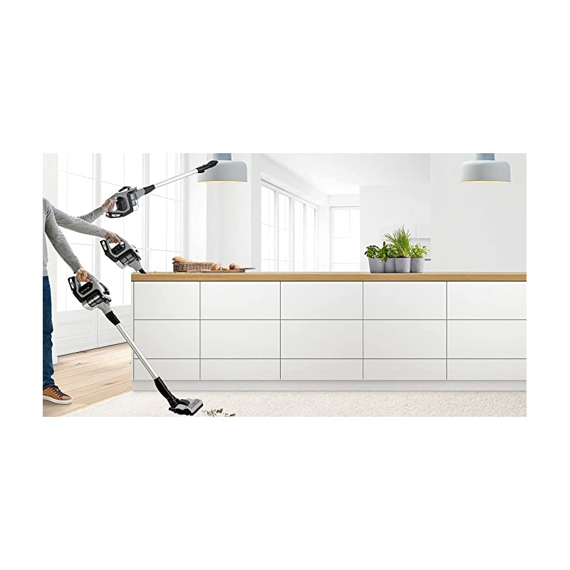The Series | 8 Unlimited ProPower BCS812KA2 from Bosch is a powerful cordless stick vacuum cleaner. The vacuum cleaner enables intensive cleaning and cleanliness on all floors thanks to the AllFloor HighPower Brush and the DigitalSpin motor. The wide range of accessories enables cleanliness on all levels, from floor to ceiling. As a handheld device, the vacuum cleaner is also suitable for cleaning cars. The cartridge filter system ensures clean exhaust air that is even cleaner than normal room air.