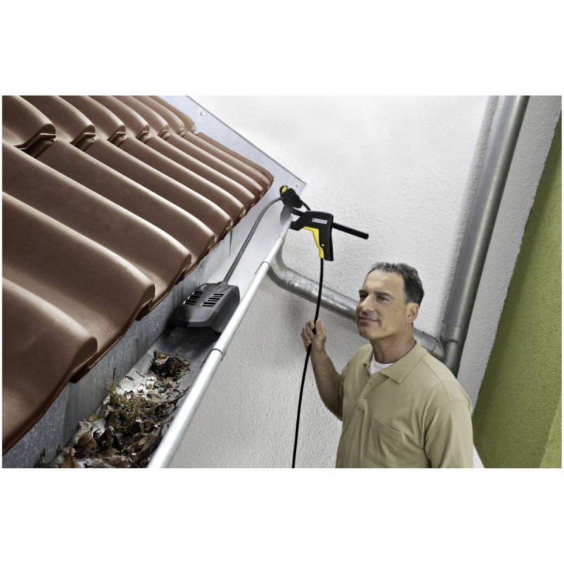 The clever 2-in-1 solution for cleaning gutters and blocked pipes. The innovative gutter and pipe cleaning kit from Kärcher works all by itself - with high pressure. It moves independently on a sled through the gutters, without the user having to stand permanently beside it on a ladder. The gutter and pipe cleaning kit is fitted with two different nozzles: one pipe cleaning nozzle with four rear-facing high-pressure jets and one gutter cleaning nozzle for mounting the hose to the sled. The user can quickly and easily switch between the applications at any time. A non-kinking hose with brass connector ensures durability. The hose is 20m long. The gutter and pipe cleaning kit is suitable for K 2 - K 7 series domestic pressure washers