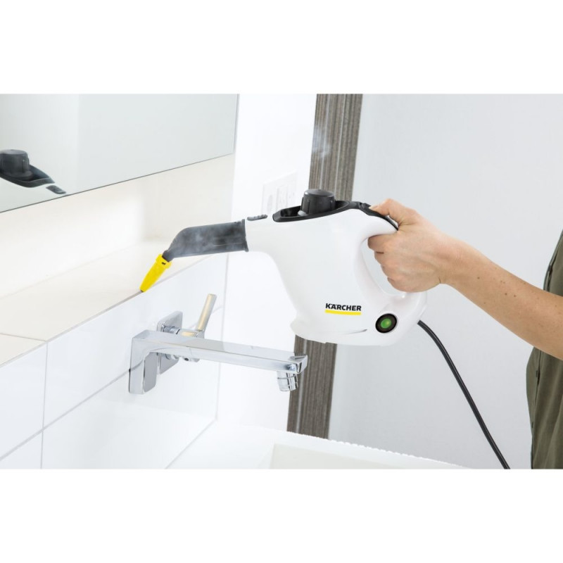 The compact Kärcher 2-in-1 steam mop SC 1 EasyFix (with floor cleaning set) can be used universally throughout the household and cleans absolutely chemical-free. Thorough cleaning with the Kärcher steam cleaner eliminates up to 99.999 % of viruses1 and 99.99 % of all common household bacteria2 on standard household hard surfaces. Thanks to its compact dimensions, the device is predestined for quick, thorough cleaning on the go. It can then be stowed away directly at the place of use without taking up much space. Whether taps, tiles, hobs, extractor hoods or the smallest cracks and niches - powerful steam and the extensive range of accessories ensure perfect cleanliness. The EasyFix floor cleaning set makes the practical hand-held steam cleaner ready for floor cleaning in no time at all. Stubborn dirt and grease deposits are removed in an instant.