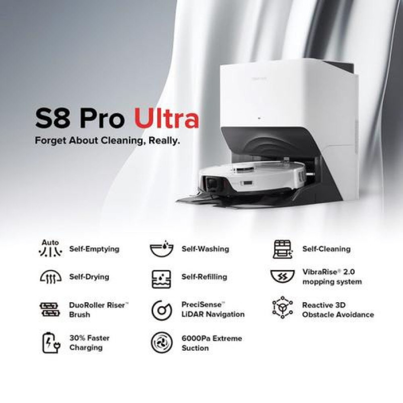 <b>Forget About Cleaning, Really.</b><br>Forget about cleaning, including robot maintenance. With Roborock’s all-in-one docking system – RockDock™ Ultra, and the most advanced cleaning technologies – DuoRoller Riser™ Brush and VibraRise® 2.0 Mopping System, S8 Pro Ultra is here to free your time.<br><br><b>Ultimate Convenience</b><br>The all-new RockDock™ Ultra boasts zero maintenance. With this all-in-one dock, you don't have to clean the robot after cleanup, bringing you a totally hands-free cleaning experience.<br><br><b>Self-Washing</b><br>Washes robot mop automatically during cleanup and when finished so you don’t have to after each use.<br><br><b>Self-Drying</b><br>Safely dries the washed mop and bottom of the dock with warm air, preventing mold growth and unpleasant odors even in wet weather.<br><br><b>Self-Emptying</b><br>Automatically empties dust and dirt after each cleanup, allowing forup to 7 weeks* without changing a dust bag. What’s more, the dual brushes clean themselves aswell.<br><br>*Actual emptying interval will depend on use habits and environmental factors.<br><br><b>Self-Refilling</b><br>Refills the robot water tank during cleanup for a maximum mopping range of over 3230sqft*(300sqm)<br><br>*Based on internal testing carried out on hard floors with a full clean water tank in the S8 Pro Ultra’s dock using default mode.<br><br><b>Self-Cleaning</b><br>Free your time with the self-cleaning design that cleans the bottom ofthe dock for easier maintenance.<br><br><b>Double the Power, Double the Clean</b><br>Get your home cleaner than ever before with the new two-fold brush and mopping system, featuring the DuoRoller Riser™ brush and VibraRise® 2.0 mopping system.<br><br><b>DuoRoller Riser™ Brush</b><br>The all-new dual rubber brushes enhance vacuuming and ensure fewer hair tangles, taking hands-free cleaning to the next level. From hardwood totiles, and even carpets and rugs, hair and dirt are easily swept away. <br><br><b>6000 Pa Extreme Suction</b><br>HyperForce® suction has been improved to 6000 Pa, this means your robot vacuum can reach deeper and capture debris and dust from hard floors and carpets.<br><br><b>Roborock Carpet Boost+ System</b><br>Carpet cleaning is a breeze with Roborock Carpet Boost+ system that'll leave your carpet mess-free from pet hair to bread crumbs.<br><br>*Compared to Roborock S7. Based on internal testing carried out by the manufacturer. Actual results may vary according to the home environment.<br><br><b>Cleans Up Spills with Better Efficiency</b><br>The VibraRise® 2.0 has improved its vibration modules two-fold, meaning that the cleaning zone is widened. Paired with high-speed scrubbing and consistent pressure on the floor, the mop can clean anything and everything, from soda to dried-on spills, effortlessly.<br><br>*Based on internal testing carried out by the manufacturer.<br><br><b>The Intelligent Combo that Offers You More</b><br>For different cleaning tasks, the brush and mop can be lifted automatically to maximize the cleaning effectiveness and also avoid leaving stains after a cleanup.<br><br><b>Quiet Mopping</b><br>Need to clean while you rest? Your robot vacuum can minimize cleaning noise when it’s mopping*, allowing you to catch up on some much-needed rest anytime.<br><br>*Tested on mop-only mode with mild scrub intensity and deep+ mop route. Based on internal testing carried out by the manufacturer.<br><br><b>Smart Enough to Stay Out of Troubles</b><br>With 3D structured light and infrared imaging technology, Reactive 3D Obstacle Avoidance system can help the robot vacuum identify and avoid potential hazards on the floors, in both bright and dark rooms, bringing you aworry-free cleaning experience.<br><br><b>PreciSense® LiDAR Navigation</b><br>PreciSense® LiDAR Navigation system is the brain behind your robot's extra ordinary ability. It’ll scan and create detailed maps to find an optimal route to clean your home, leaving dirt with no escape.<br><br><b>Total Control Is a Tap Away</b><br>- Custom Cleaning Routines:decide on your time when the robot cleans with custom cleaning schedules, and set cleaning routines for particular areas.<br>- 3D Mapping:allows you to accurately build your house virtually, you can create the most detailed map of your house, ensuring that you get the best possible cleaning. <br>- Multi-level Mapping System:automatically recognizes distinct levels of your home. Up to four floors supported.<br><br><b>Smart Suggestions for No-Go-Zones</b><br>Automatically detects easy-to-get-stuck places and suggests No-Go Zones to prevent your robot vacuum from getting caught in small spaces. You can also draw Invisible Walls that block certain areas from your robot vacuum’s entry in the Roborock App.<br><br><b>Map Quicker, Clean Faster</b><br>Experience fast and effective cleaning as your robot vacuum can create a map up to 6 times faster* before the first cleaning task and can clean your daily area 30% faster when needed.<br><br>*Compared to Clean & Mapping mode. Actual results may vary according to the home environment.<br><br><b>Fast Charging & Off Peak Charging Supported</b><br>Quickly resumes cleaning by charging 30% faster* than before. You can choose off-peak times to charge to save on power as well as the costs of using peak-time electricity.<br><br>*Compared to Roborock S7. Based on internal testing carried out by the manufacturer.Roborock S8 Pro Ultra. Dust container type: Bagless, Product colour: White, Shape: Round. Dust capacity (total): 0.35 L, Noise level: 67 dB, Water tank capacity: 0.2 L. Battery technology: Lithium-Ion (Li-Ion), Battery capacity: 5200 mAh, Runtime: 180 min. Height: 96.5 mm, Width: 350 mm, Depth: 353 mm. Package width: 538.5 mm, Package depth: 515.6 mm, Package height: 485.1 mm