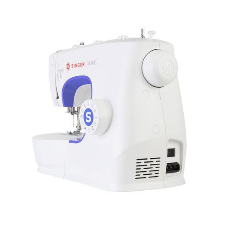 23 stitches. Basic, stretch and decorative stitches for sewing a wide range of fabrics and sewing techniques. Also includes a one-step buttonhole.<br><br>One-step buttonhole. Sew buttonholes in one easy step! Just place your button into the foot’s holder to sew a buttonhole perfectly sized for your button with consistent results every time.<br><br>Easy stitchion. Stitches are clearly displayed on the Stitch Selector Dial. Just turn the dial to your stitch.<br><br>Adjustable stitch length. Use the Stitch Length Dial to customize stitches for various sewing techniques and decorative applications. <br><br>Adjustable stitch width. Use the Stitch Width Dial to customize stitch width for a variety of sewing techniques and decorative applications. <br><br>Quick and easy threading. Simple-to-follow threading guides for winding the bobbin and threading the upper thread are conveniently marked directly on the machine.<br><br>Needle threader. Effortlessly threads the eye of the needle for you, saving time and eliminating eye strain. <br><br>Full metal frame. This internal rigid metal support keeps your machine stable and helps ensure long lasting durability. <br><br>Front-loading bobbin. The machine uses a SINGER® Class 15 (transparent style) bobbin. Just place the bobbin into the bobbin holder, draw up the bobbin thread and you’re ready to sew. <br><br>Adjustable thread tension. Depending on your fabric and threadion, the Thread Tension Dial can be used to fine-tune the look of your stitch as desired. <br><br>STAYBRIGHT™ led lighting. Long lasting LED lighting provides bright illumination of the sewing area to help eliminate shadows. <br><br>Extra high presser foot lift. Offers more clearance under the presser foot, which is needed when placing multiple layersthick fabric underneath it. <br><br>Free arm. Slide the Removable Storage Compartment off the machine to access the free arm for sewing cuffs, collars, trouser hems and more.<br><br>Free accessories included. Presser feet included are the All-Purpose Foot, One-Step Buttonhole Foot, Zipper Foot and Button Sewing Foot. Other included accessories are: Pack of Needles, Seam Ripper/Lint Brush, Screwdriver, Extra SINGER® Class 15 Bobbins (transparent style), Thread Spool Cap, Spool Pin Felt, Edge/Quilting Guide, Darning Plate, and Soft Dust Cover. Accessories can be stored inside the Removable Storage Compartment.SINGER M3405. Product colour: Blue, White, Type: Manual sewing machine, Sewing machine functions: Sewing. Power supply type: Mechanical. Sewing machine accessories included: Button sewing foot, Buttonhole foot, Cover, Zipper foot
