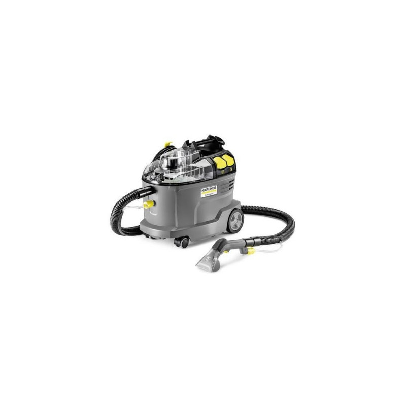 Robust, durable, efficient: The Puzzi 8/1 spray extraction cleaner from Kärcher impressively cleans upholstery and removes stains from textile surfaces with outstanding and hygienic cleaning results and high efficiency. The compact spray extraction machine sprays the cleaning solution deep into the textile fibres and then removes it again with the dislodged dirt. This excellent back suction performance also ensures quick drying and means that the textile surfaces can be used again quickly – ideal for the high demands of cleaning professionals in the hotel and hospitality sector or in vehicle interior cleaning. The standard, extra-short upholstery nozzle for convenient, ergonomic cleaning of narrow spaces can also be used. Thanks to its very low weight and ergonomic carrying handle, the spray extraction cleaner can easily be transported with one hand. Large push-buttons that can be operated by hand or foot also increase convenience for the user. The appliance lid and the hand nozzle are transparent for a better view of the dirty water.<br><br><b>Outstanding cleaning performance</b><br>Perfect fibre-deep cleaning of textile surfaces. Fast drying means that surfaces can quickly be used again thanks to the excellent back suction performance. Excellent cleaning result with visible before-and-after effect.<br><br><b>Ergonomically designed and extra-short upholstery nozzle</b><br>Handle and pressure switches can be operated with just one finger. Practical knob shape allows different holding positions. Red nozzle mouthpiece ensures efficient water consumption.<br><br><b>Light weight and compact, robust design</b><br>Effortless, also one-handed transport over ledges and steps. Designed for long periods of fatigue-free use. Long service life ensures high efficiency.<br><br>Kärcher Puzzi 8/1. Maximum input power: 1200 W. Type: Drum vacuum, Cleaning type: Wet, Dust container type: Bagless, Dust capacity: 7 L. Vacuum air filtering: Water, Noise level: 71 dB. Product colour: Black, Grey, Yellow