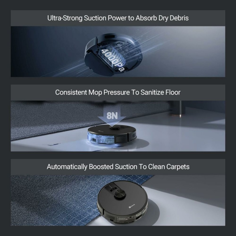 The Ezviz RE4 Plus is an advanced robot vacuum cleaner that combines cutting-edge technology to provide efficient and thorough cleaning in modern homes. Equipped with a suction power of up to 4000 Pa, this robot effectively vacuums dust, dirt, and pet hair, while its mopping function adds an extra level of cleanliness on hard floors. Thanks to its navigation system using LDS LiDAR technology and infrared sensors, the robot can intelligently detect and avoid obstacles, planning optimal routes for complete coverage without interruptions. Its compact black design allows access to narrow spaces, and its battery life of 3 to 4 hours enables extended cleaning sessions without recharging, which takes approximately 5 hours. A key feature is its automatic dustbin emptying system, which can store collected dirt for up to 90 days, ideal for users with limited time or pet owners. This system optimizes robot maintenance by reducing the need to frequently empty the dust container. Overall, the Ezviz RE4 Plus offers a versatile and technological solution to keep your home clean with minimal intervention, balancing power, autonomy, and smart functions that simplify daily care.
