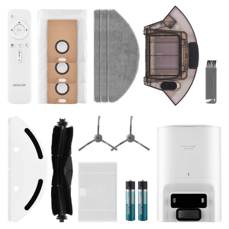 The device includes additional side brushes, 3 mops (+ attachment), 1 additional HEPA and foam filter, cleaning brush, 2 AAA batteries, charging/emptying dock, and remote control.