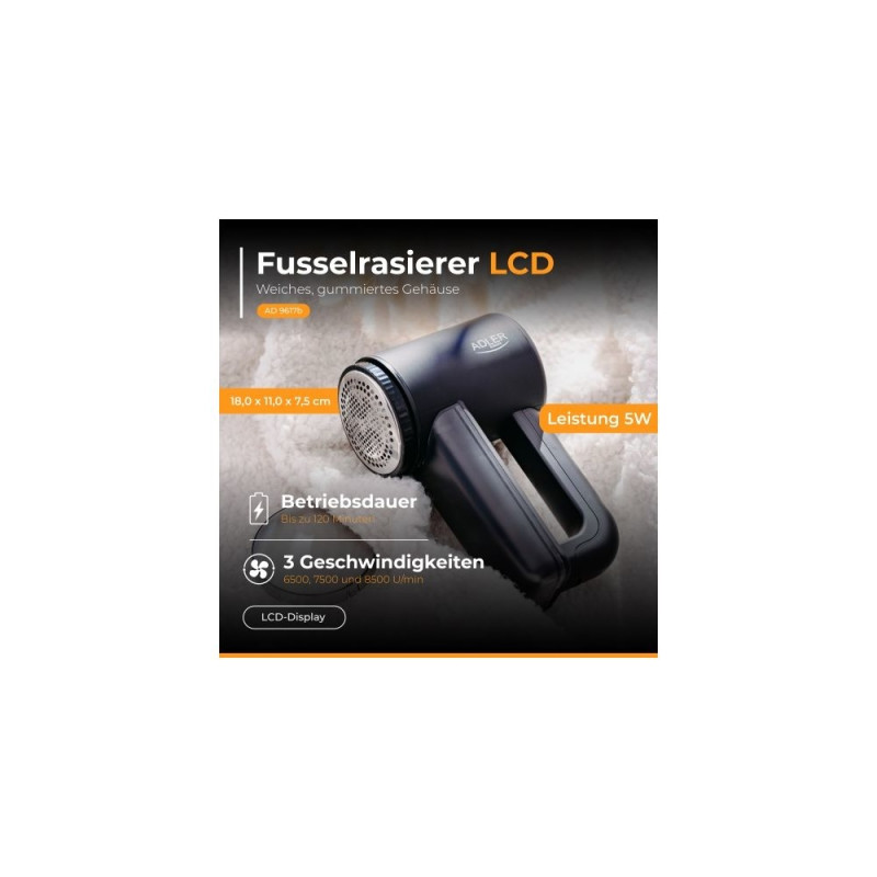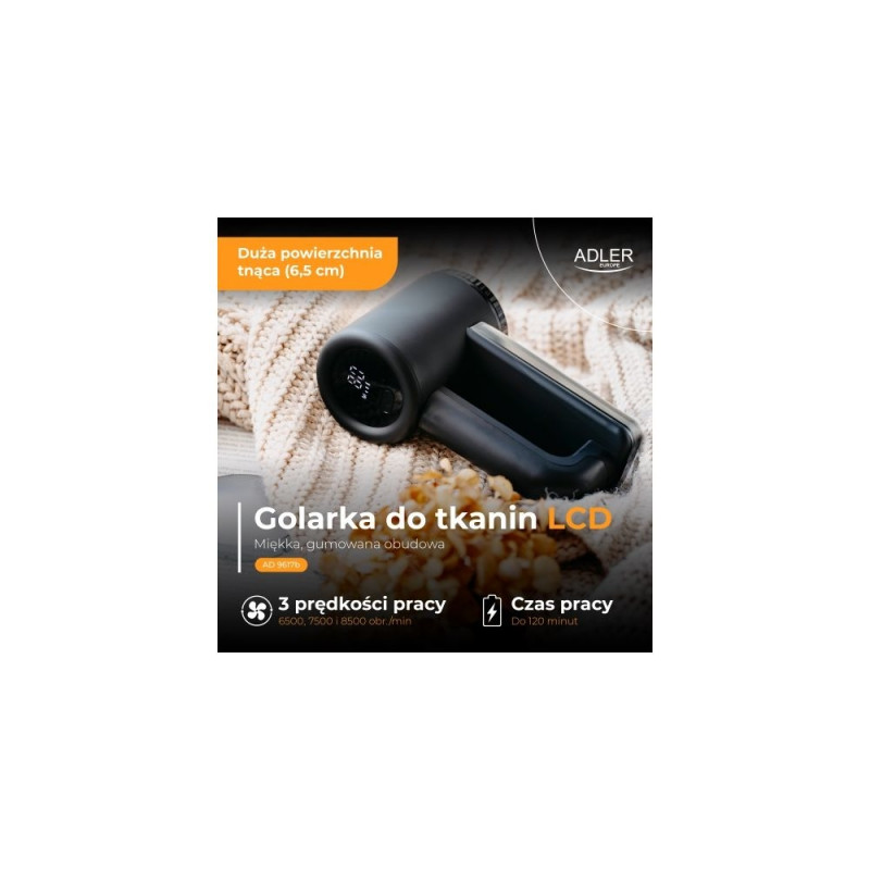 Adler AD 9617 to nowoczesna, wydajna golarka do tkanin, która skutecznie usuwa zmechacenia, supełki i włókna z ubrań, koców i tapicerki. Dzięki cyfrowemu wyświetlaczowi LCD oraz możliwości wyboru spośród trzech prędkości pracy, urządzenie zapewnia pełną kontrolę i komfort użytkowania - zarówno w domu, jak i w podróży.