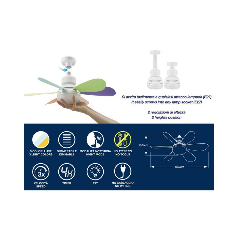 | Special notes | Dual function (ventilation + lighting), 3 selectable light colours (white, natural, warm), adjustable light intensity, night light function, silent operation, suitable for home, office, garage |