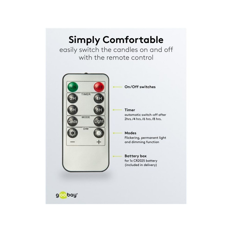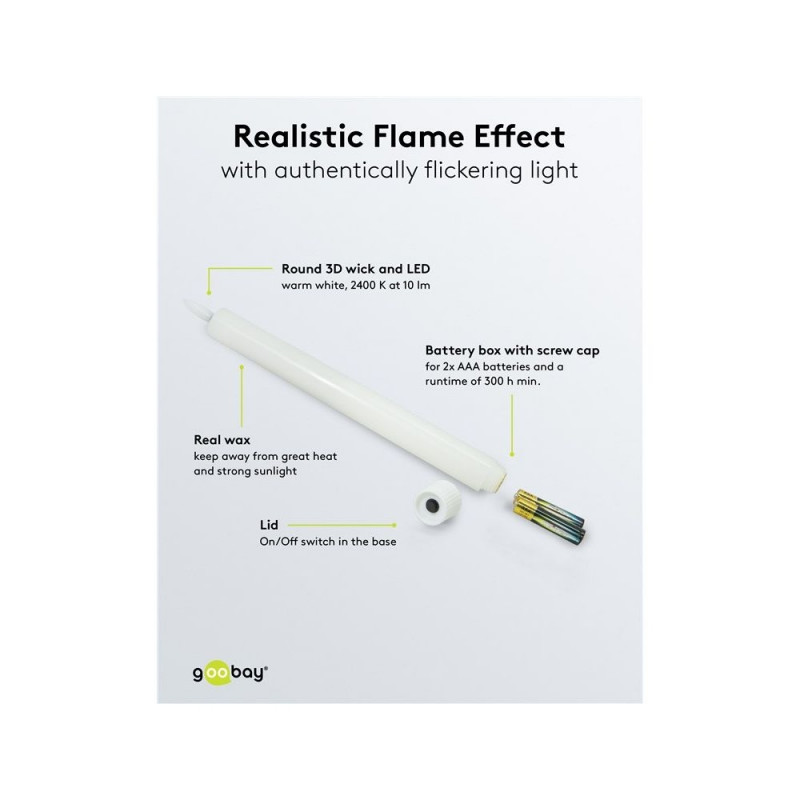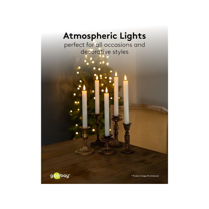 | Description | The traditional elegance of real wax candles meets modern, safe lighting technology: With realistic flickering effects and its wax coating, the candle set creates the warm, harmonious atmosphere of real candles – without ever burning out, sooting or creat |