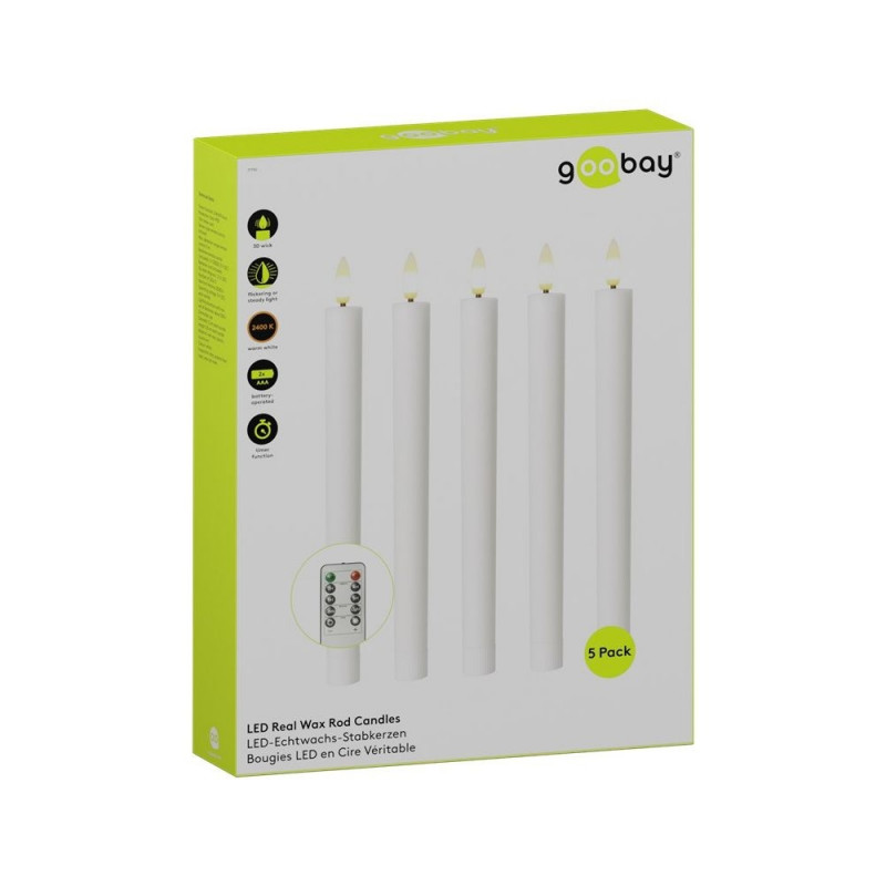 Goobay Set of 5 LED Real Wax Rod Candles, white, incl. Remote Control