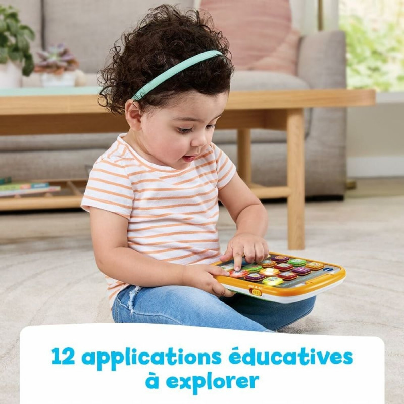 The Vtech Baby Interactive Toddler Tablet is a bilingual educational device specially designed for babies and toddlers from 0 months up to 3 years old, offering a playful and educational experience in French and English. This device features an attractive multicolor and orange design made of durable plastic, suitable for everyday use by little hands. It includes 12 illuminated buttons that activate various activities promoting vocabulary, sounds, songs, and melodies, stimulating the child's attention and auditory development. Its simple interface and bright colors are ideal for engaging babies and toddlers in their early educational explorations. It operates with 2 LR03 batteries included, ensuring safe and long-lasting use, and incorporates an automatic shut-off function to preserve battery life and prevent unnecessary power consumption. The tablet does not specify a particular model within the Vtech Baby range, positioning it as a practical and affordable tool to introduce children to bilingualism from an early age, developing basic language skills in an interactive and entertaining environment. This device combines functionality, safety, and pedagogy in a technology piece adapted for the initial stage of child learning.