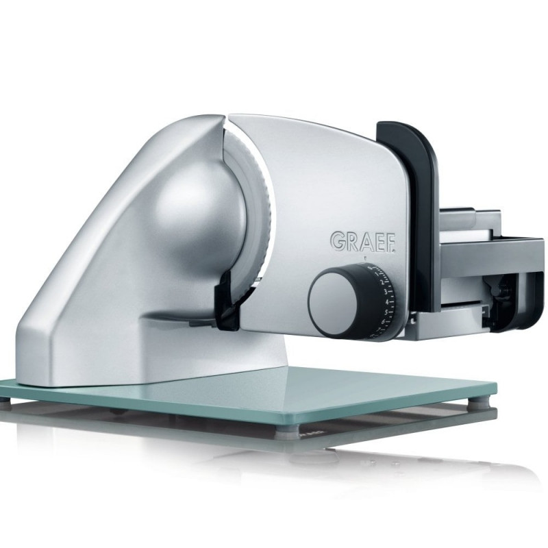 Elektrinė maisto pjaustyklė, turinti metalinį korpusą, modernų grūdinto stiklo atraminį padą.