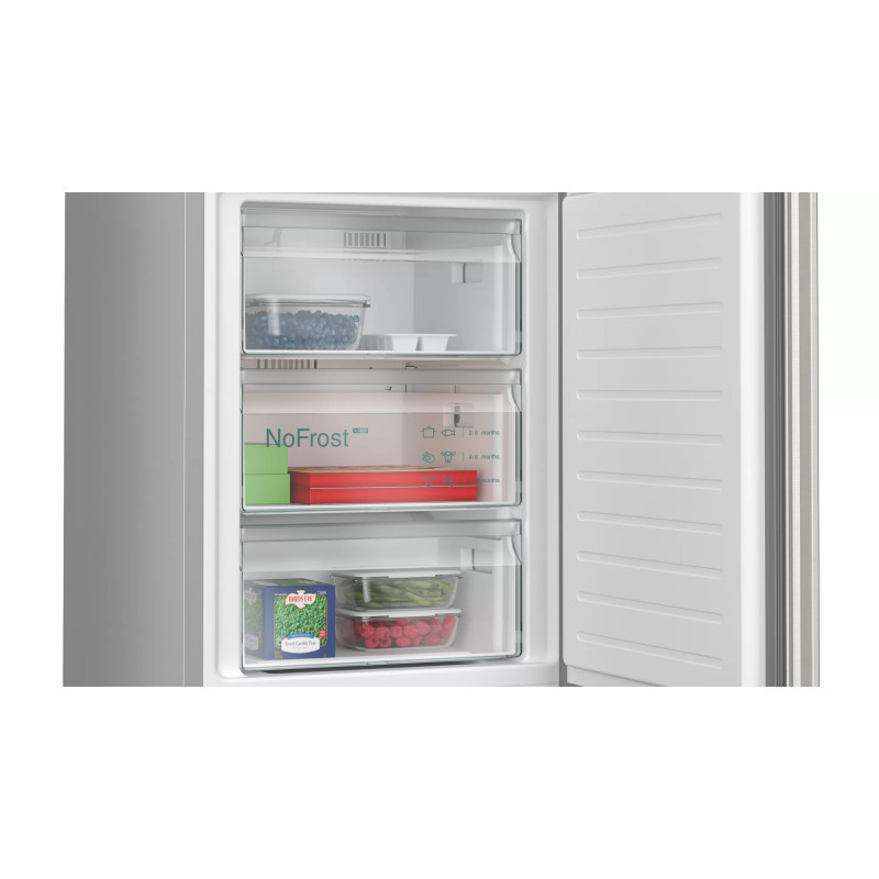 With a total capacity of 363 liters, the Siemens KG39NXIBF fridge/freezer combination is ideal for large households and offers a lot of convenience. In the 260 liter refrigerated area, fresh food has plenty of space on five shelves made of safety glass, three of which are height-adjustable and four extendable, in a hyperFresh box with humidity control for fruit and vegetables and a hyperFresh 0°C box, as well as in four door compartments. The super cooling function cools newly inserted food more quickly and thus offers protection for food that has already been stored. The freezer area is 103 liters and is equipped with three transparent freezer drawers. Thanks to the noFrost technology against ice formation, the freezer compartment never has to be laboriously defrosted again. The temperature control of the KG39NXIBF is electronically separated for each temperature zone and can be read via LED. With a power consumption of 129 kWh per year, the KG39NXIBF is classified in energy efficiency class B.