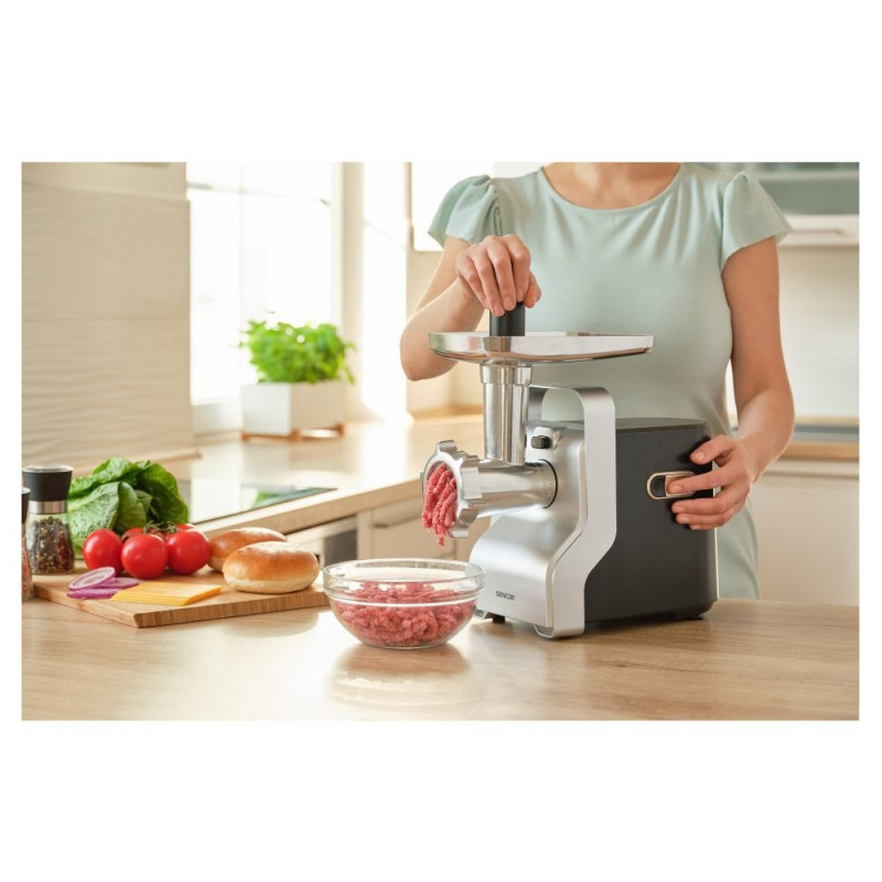 Mince different types of meat quick and easy with a meat grinder. The mincing blade and discs are made from durable steel, the filling pan is made of aluminum. The set includes a food pusher with sausage and kubbe attachments.