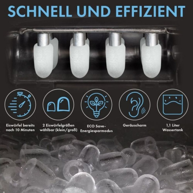 The LED display informs you about a full ice cube container or an empty water tank. Additionally, the ECO Save energy-saving mode ensures automatic shutdown when the container is full, while the cleaning program ensures hygienic cleanliness.