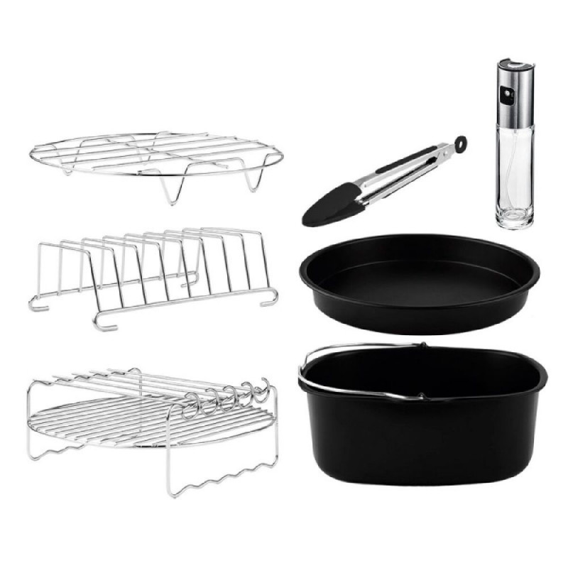 The FRYKIT accessory kit by Cecotec is a complete set designed to expand the functions of your air fryer, making it easier to prepare a wide variety of recipes with maximum convenience and efficiency. This pack includes useful accessories made of black plastic and stainless steel, durable and easy to clean thanks to their non-stick coating, which are also dishwasher safe, ensuring optimal hygiene effortlessly. Among its components are a 20 x 2.5 cm pizza mold, ideal for cooking homemade pizzas evenly and practically; a 20 x 7.2 cm baking mold that allows you to make desserts without dirtying the fryer basket, increasing versatility to prepare everything from cakes to flans; and 21 cm silicone-tipped tongs that make handling food easier without damaging it. For cooking meats, it includes a 20 x 14.7 cm grilling rack and skewer sticks that ensure even and healthy cooking, helping achieve juicy, well-cooked results. Additionally, it comes with a 19.5 x 2.5 cm metal stand and a 14.7 x 10.5 cm toast rack, expanding options for different preparations. To facilitate oil dosing and application, there is a handy 100 ml dispenser bottle and an oil sprayer, allowing you to cook with the right amount and control fat usage. This kit is free of bisphenol A (BPA), offering a safe alternative for your health. With this set of accessories compatible with Cecotec, you can cook healthily, quickly, and flexibly, adapting each tool to your culinary needs. The FRYKIT is a practical solution to maximize your air fryer’s use, making it easier to prepare varied dishes and clean up afterwards.