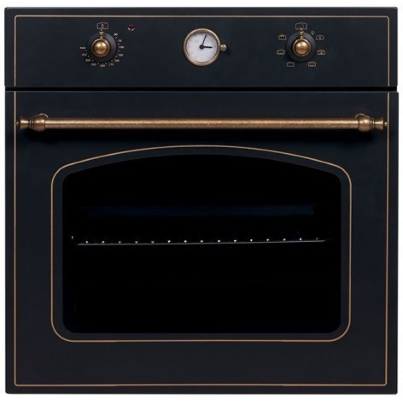 Rustic "aged" gold colored details give the oven a particularly rustic look. Control through mechanical rotary knobs.
