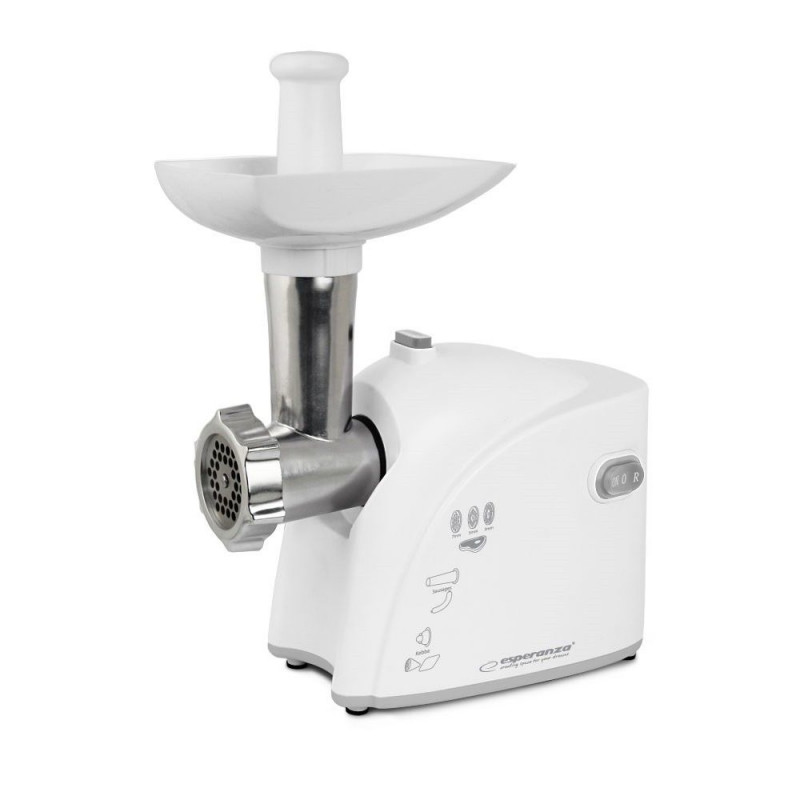 The Esperanza MUSAKA meat grinder is a modern and functional device that should be part of every kitchen. Thanks to 3 strainers with different hole diameters (3 mm, 5 mm, 7 mm), you can grind not only meat, but also other food products. It also has additional attachments for making sausages and "kebbe". Anti-slip rubber feet guarantee stable and safe operation of the device. maximum power: 2200 W stainless steel knife with long service life metal worm drive 3 disc strainers with different hole diameters: 3.0mm 5.0mm 7.0mm forward and reverse movement function nozzle for making sausages nozzle for kneading kebbe balls non-slip rubber inserts ensuring stable operation of the device net weight: 2.17 kg product dimensions: 26.5 x 13.0 x 35.0 [cm] power cord length: approx. 85 cm power supply: 230V, 50Hz