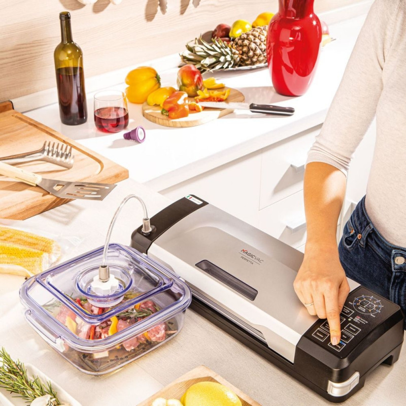 The Magic Vac Perfetta is a high performance vacuum sealer with an innovative digital vacuum control. It has features such as "ActiSeal3D" technology for optimal sealing and a "MARINATING" function for quick marinating of food.