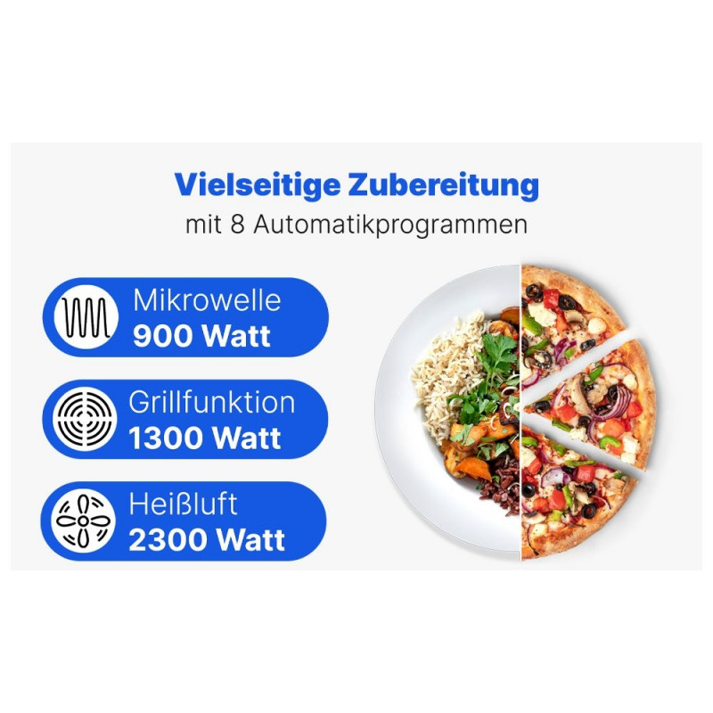 8 automatic programs for heating pizza, meat, vegetables, rice, potatoes, fish, drinks and popcorn.