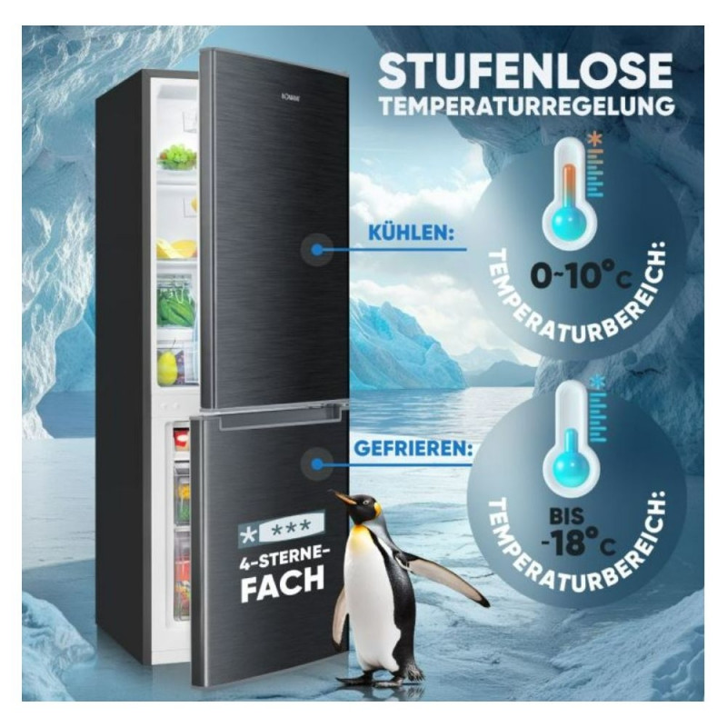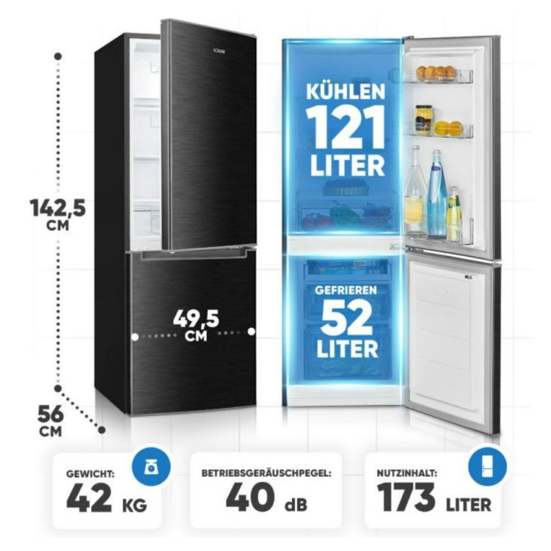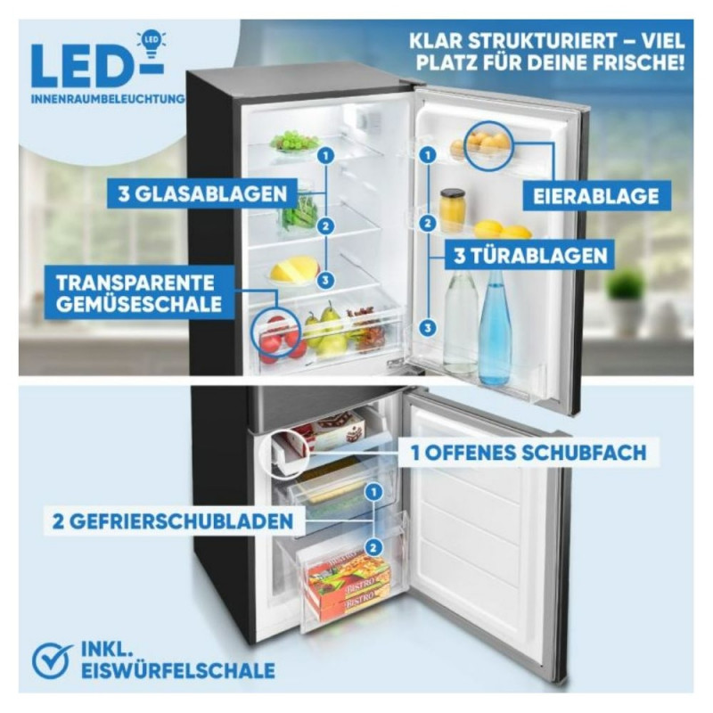 Generous storage space - With a total volume of 173 liters (divided into 121L cooling and 52L freezing), 3 shelves as well as 3 drawers and a transparent vegetable tray, the Bomann freestanding fridge freezer combination offers enough space for your food and enables efficient organization