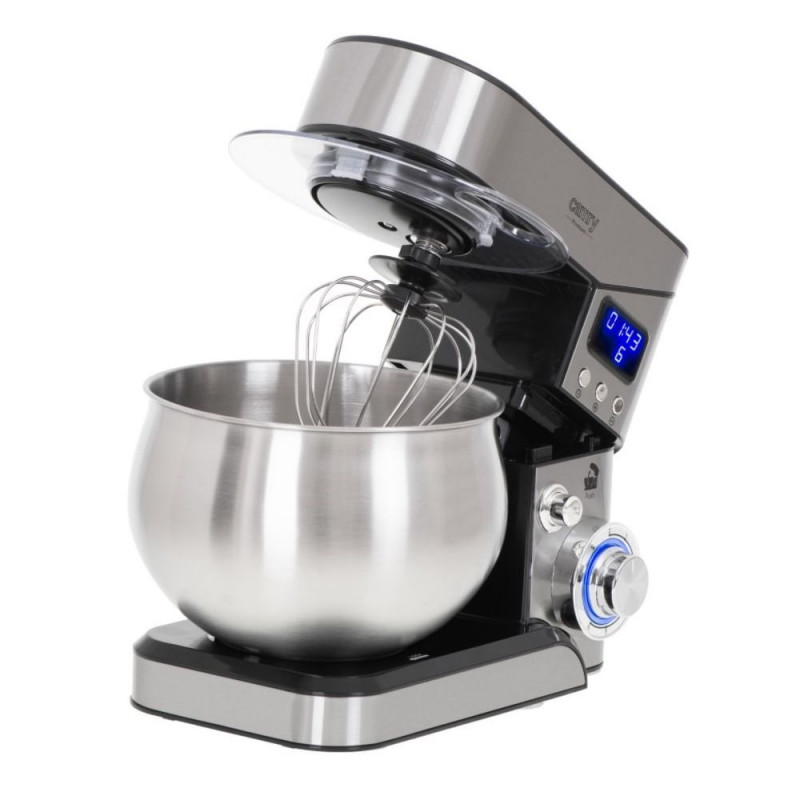 The Camry CR 4223 features a powerful 2000 W motor and 6 variable speeds controlled via buttons and rotary dial, allowing for precise food processing. The appliance also includes a large 5 L stainless steel bowl capacity, built-in LCD display, and multiple attachments for versatile kitchen use.