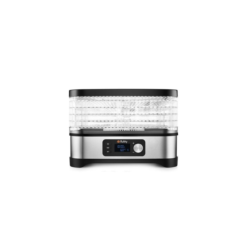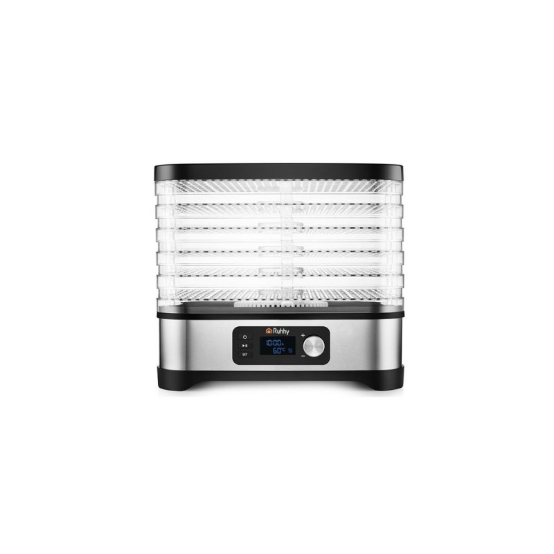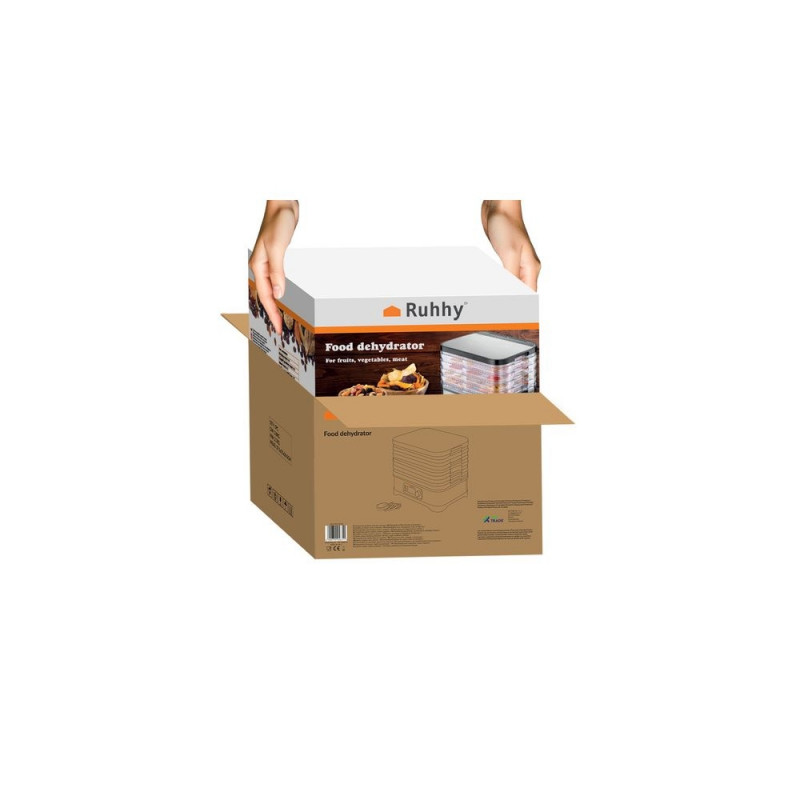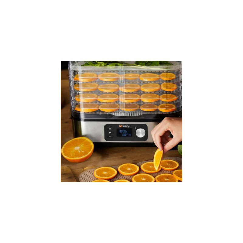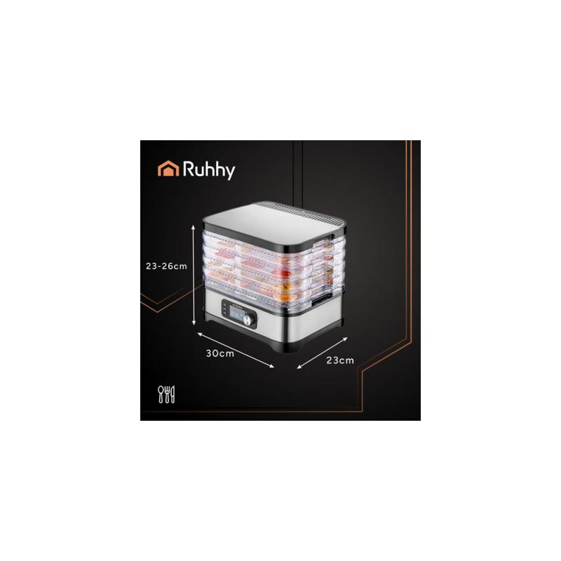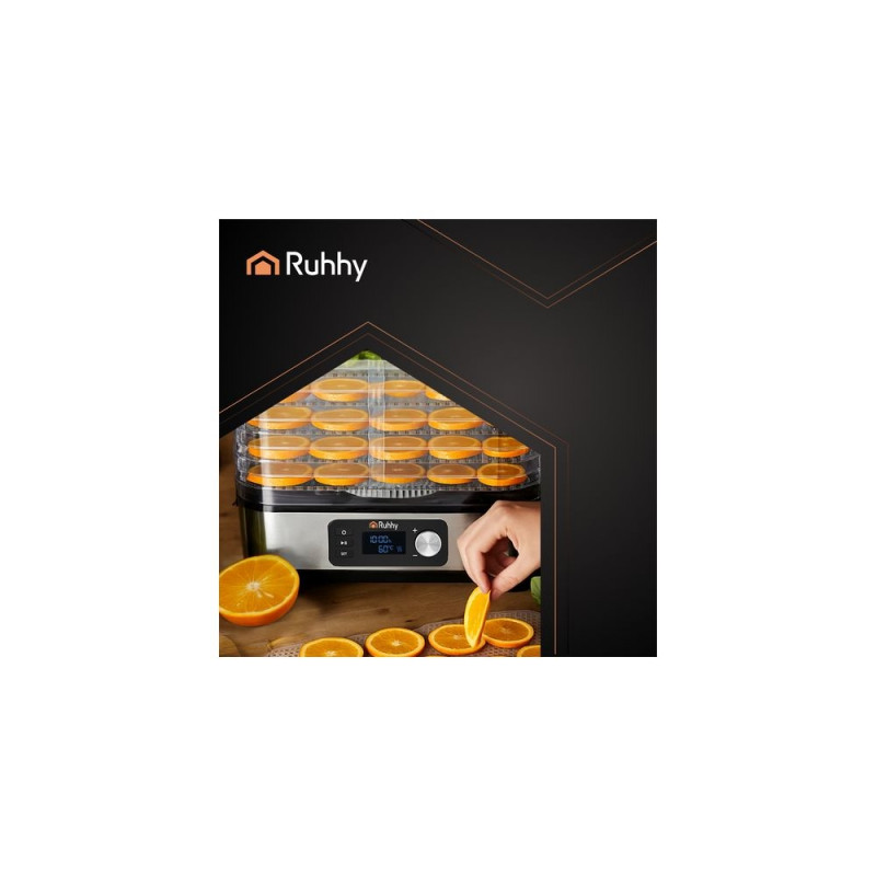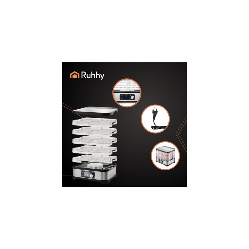 Uniwersalna suszarka RUHHY o mocy 400 W umożliwia suszenie grzybów, owoców, warzyw i ziół ? ma aż 5 tacek o łącznej pojemności 10 litrów, regulowaną temperaturę (35?70°C) oraz czytelny wyświetlacz LCD z programatorem do 72 godzin. W zestawie znajdują się również tacki do płynnych produktów, siatki i maty nieprzywierające ? dla maksymalnej wygody. Energooszczędna i wykonana z bezpiecznych materiałów BPA FREE ? idealna do domowej spiżarni przez cały rok.