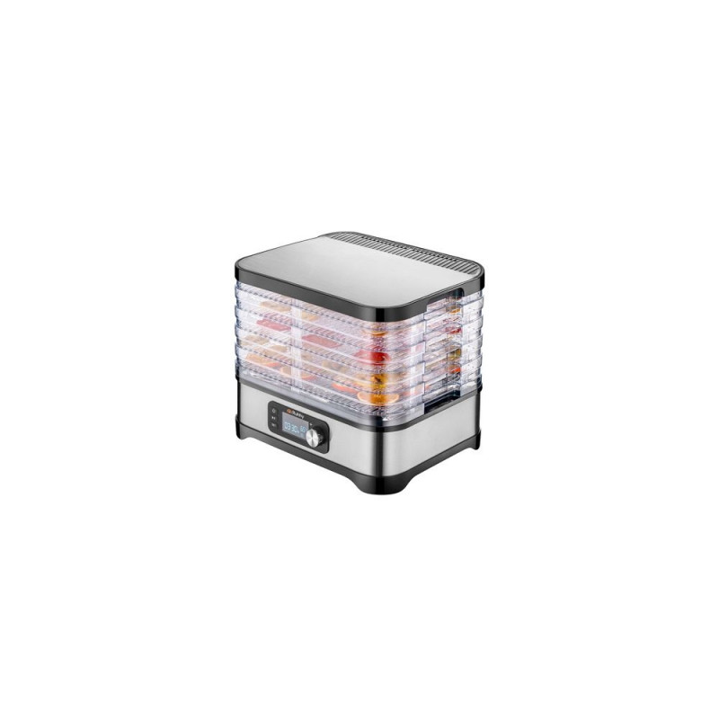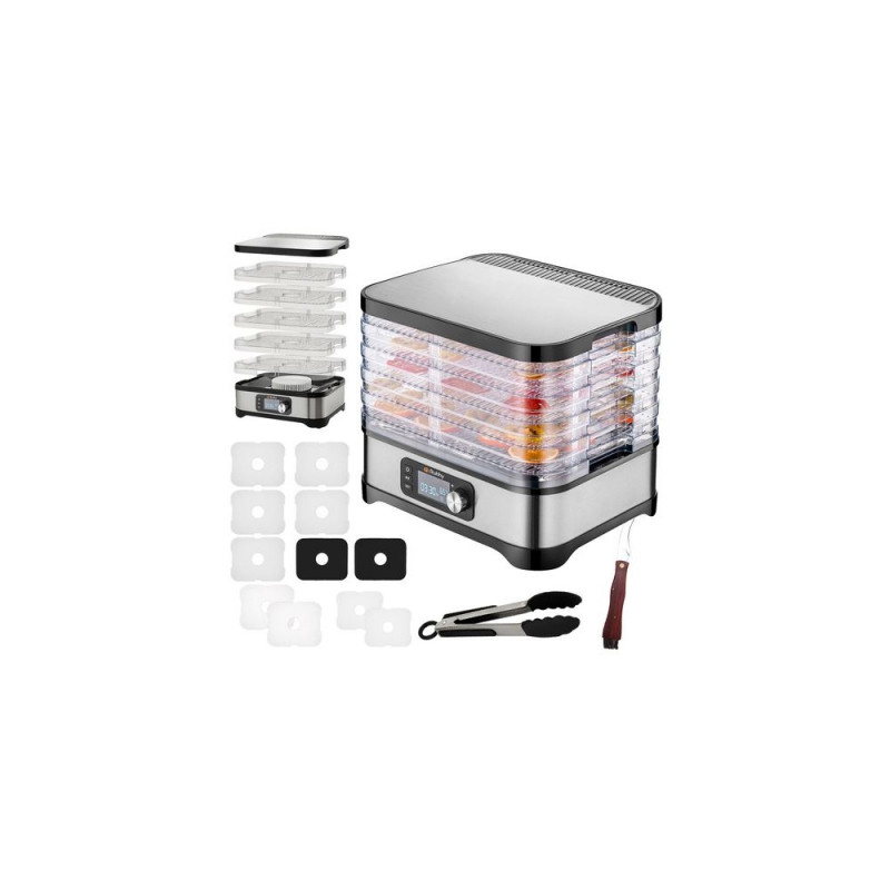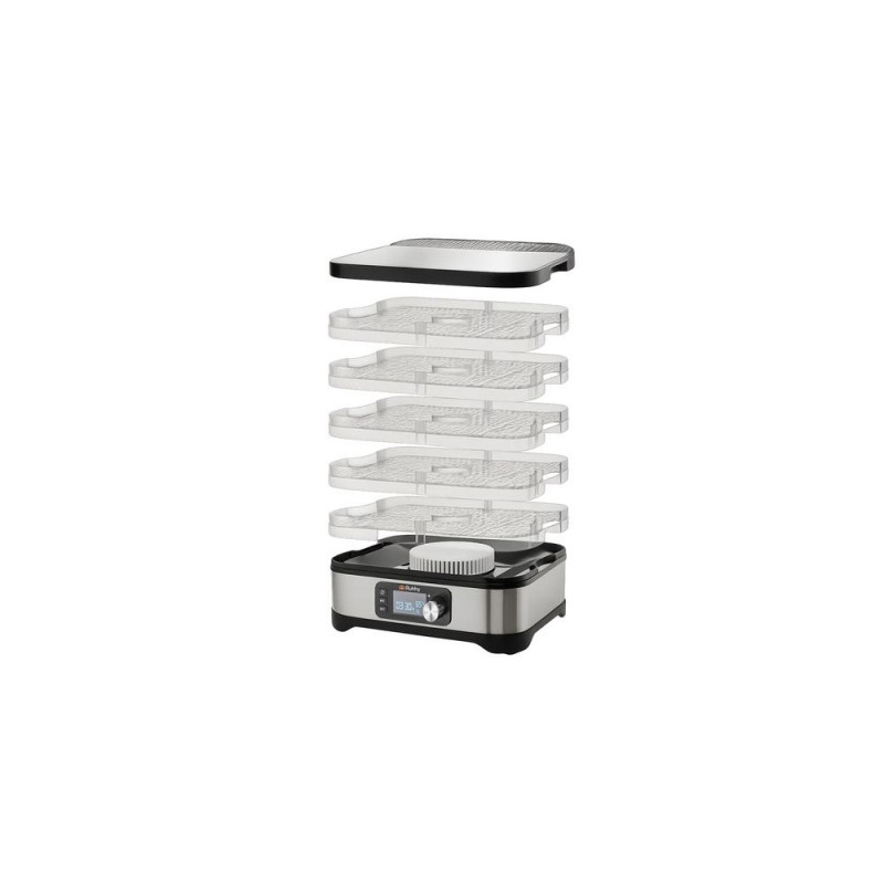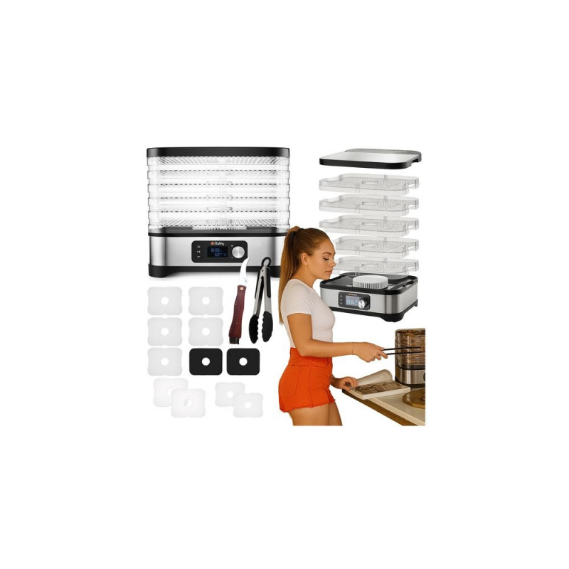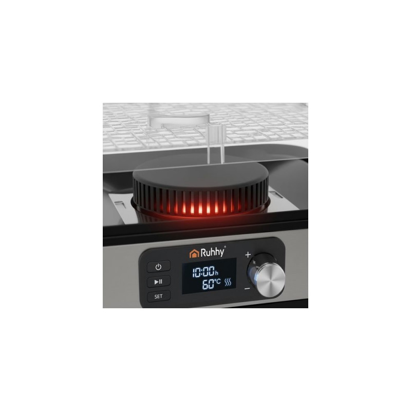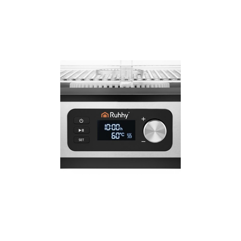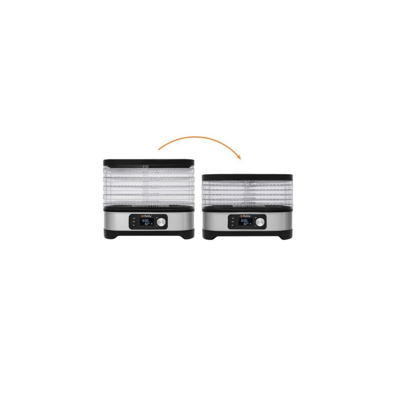 Uniwersalna suszarka RUHHY o mocy 400 W umożliwia suszenie grzybów, owoców, warzyw i ziół ? ma aż 5 tacek o łącznej pojemności 10 litrów, regulowaną temperaturę (35?70°C) oraz czytelny wyświetlacz LCD z programatorem do 72 godzin. W zestawie znajdują się również tacki do płynnych produktów, siatki i maty nieprzywierające ? dla maksymalnej wygody. Energooszczędna i wykonana z bezpiecznych materiałów BPA FREE ? idealna do domowej spiżarni przez cały rok.