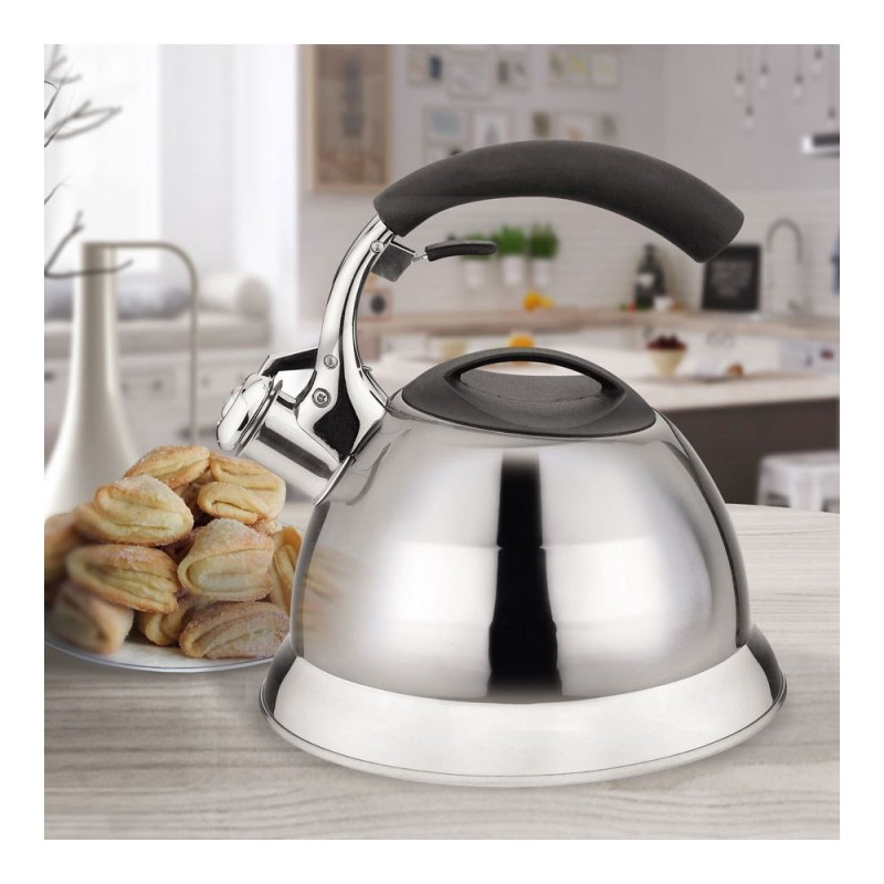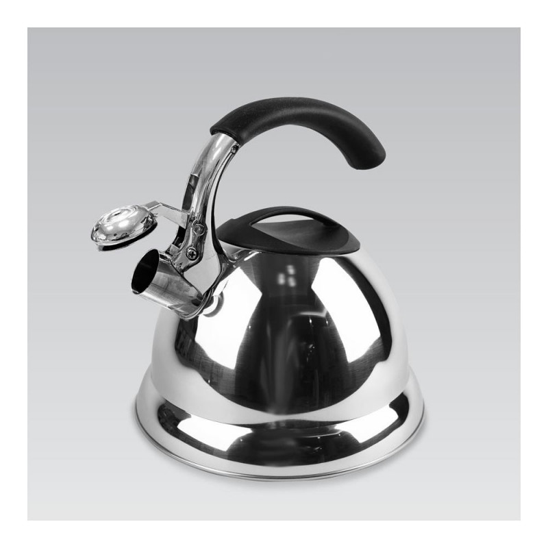 The Kettle MAESTRO MR-1314 has a 3-liter stainless steel capacity and is suitable for various hob types including gas, induction, and electric. It features a manual lid opening, a hinged whistle, and a cool touch black handle.Warning: Last items in stock!