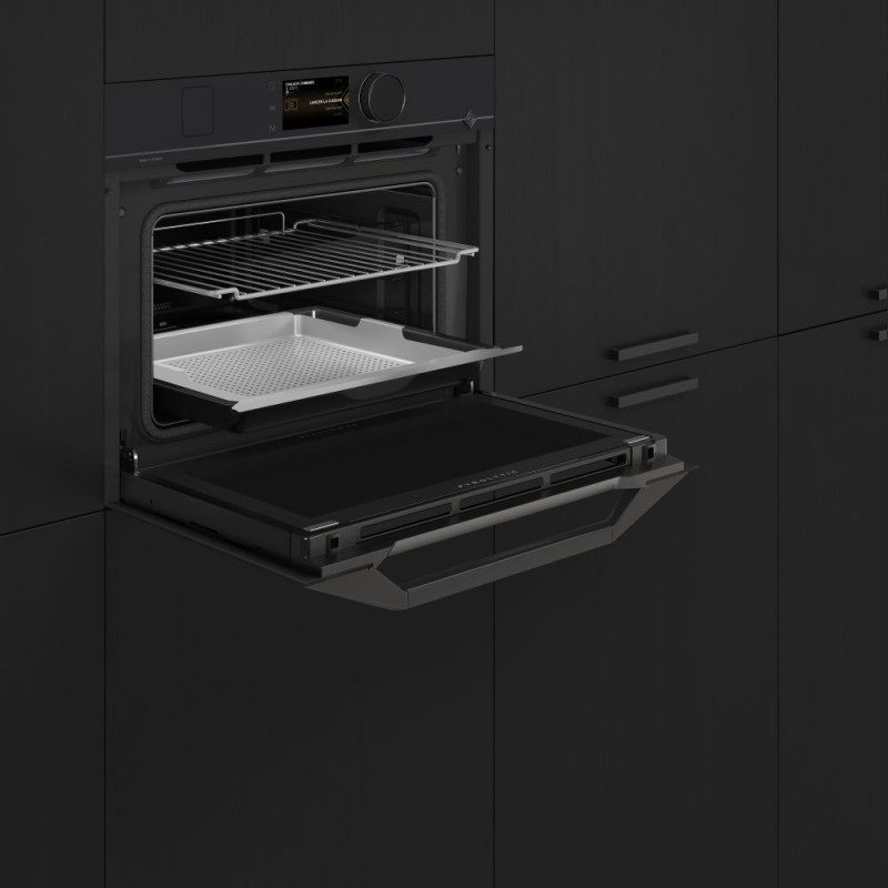 Included with the oven are deep baking tray, grill grate and a special steam dish tray.