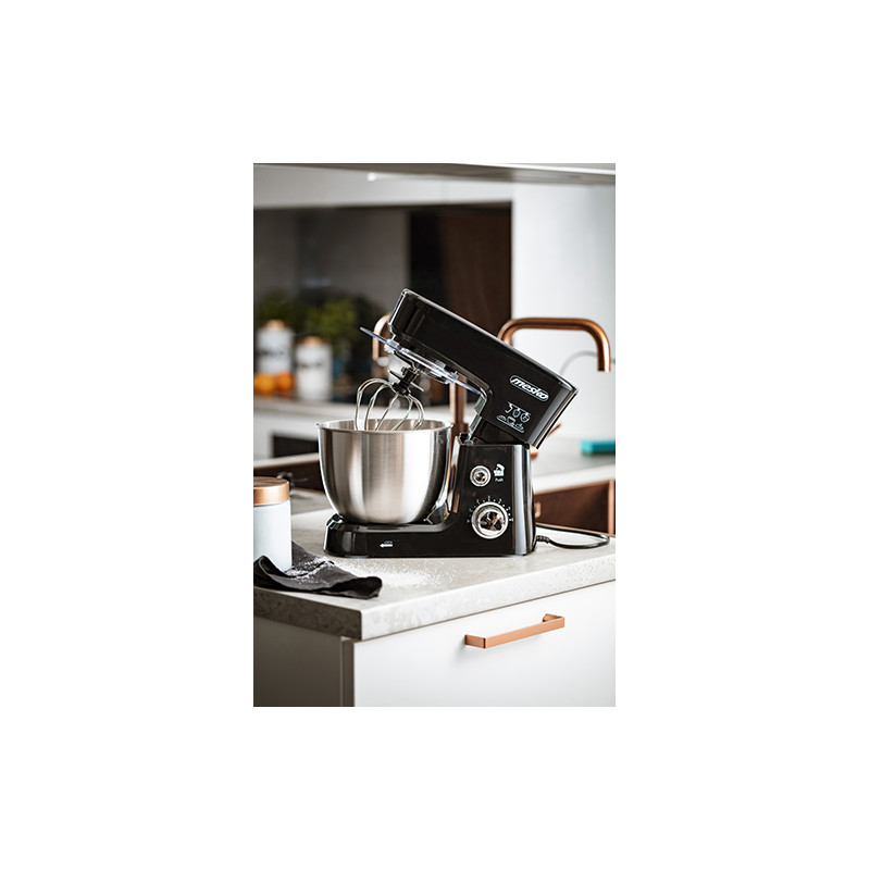 A multifunctional robot is the basis of work in most kitchens. By combining several functions and taking up a small amount of space, it is an alternative to small-size kitchens. The robot itself looks very elegant, so nothing stands in the way of its standing on the kitchen counter. The tilt button and speed selector are located in an easily accessible place on the side of the device, which increases the comfort of work. The images above the knobs suggest which parts are better to use to whip cream, eggs or mix the dough. The tilting head makes it easy to remove the bowl with the prepared dough or cream. Stable suction cups prevent the device from sliding over the kitchen counter. The anti-splatter cover will protect the kitchen counter from splashing, which is a common problem with traditional mixers. Keeping this product clean also does not require much effort. All accessories can be washed in water with washing-up liquid. However, the outer parts and the body can be cleaned with a kitchen towel or a soft cloth.