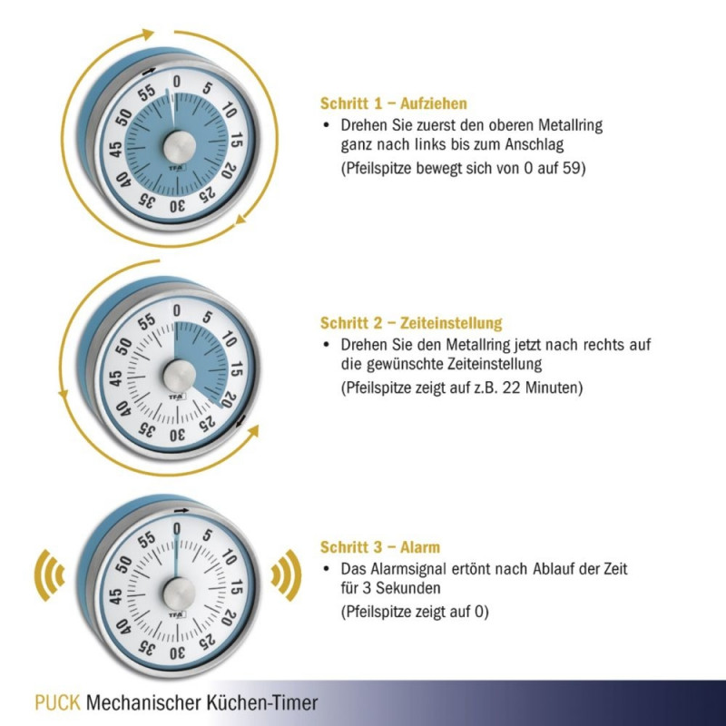When it's a matter of minutes when cooking, the design timer by PUCK does a good job. The practical kitchen helper made of stainless steel and rubberised plastic not only ensures the perfect breakfast egg, it also reminds you to put the cake in the oven or the noodles in the pot. With the mechanical metal winding movement, you can set up to 60 minutes continuously. The coloured remaining time display clearly shows how much time is left. A signal tone reliably reminds you of the right time. With the practical magnet, you can easily attach the timer to your fridge or other metal surfaces.