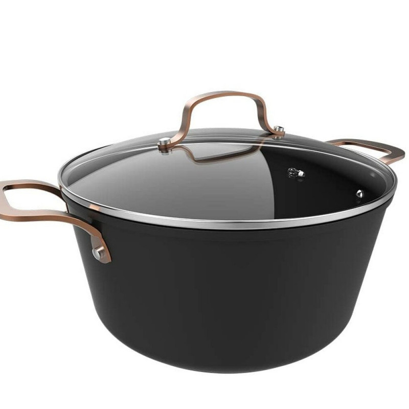 The Cecotec Fantasy Pot with Lid stands out as a robust and versatile choice for those seeking quality and functionality in everyday cooking. Made from high-quality forged aluminum with a Ø 28 cm diameter and a generous 7.1-liter capacity, this pot ensures excellent heat distribution thanks to its Full Induction EcoHeat diffuser base, compatible with all types of stovetops, including induction, and designed to save energy during cooking. Its Platinum Plus Teflon® non-stick coating, completely PFOA-free and composed of three ceramic-reinforced layers, guarantees healthy cooking and easy cleaning, and is dishwasher safe even with frequent use. It features riveted stainless steel handles with an elegant rose gold finish, providing safety and a distinctive touch, as well as a tempered glass lid with a steam release hole for easy monitoring of the cooking process. The pot’s body includes a warp-resistant 4 mm thick base and five layers that enhance its strength and durability, while its design allows oven use up to 230 ºC (without the lid), expanding your culinary possibilities. Attention to detail and the use of premium materials make the Cecotec Fantasy a reliable and efficient tool for both daily meals and more elaborate recipes, making it an essential item for those who value practicality and durability in their cookware.