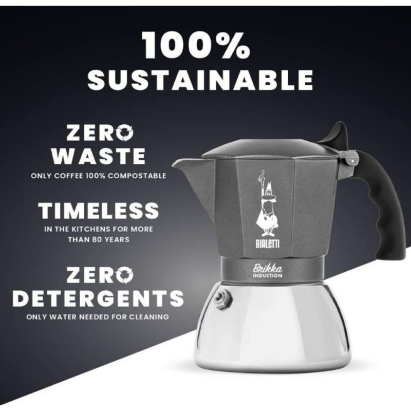 The product is suitable for all induction hobs thanks to the innovative bi-layer boiler that allows a perfect distribution of heat and thus a perfect dispensing of coffee.
