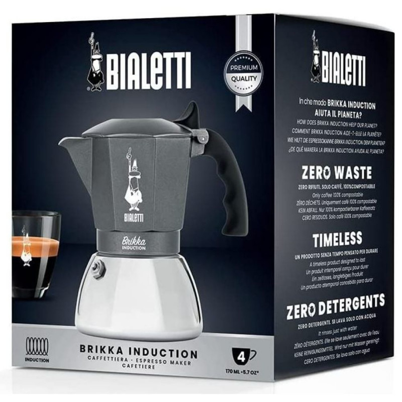 The size of the Brikka Induction is measured in cups; the coffee can be enjoyed in espresso cups or larger cups, according to your needs. Brikka Induction is available in 4-cup size (160 ml coffee + cream).