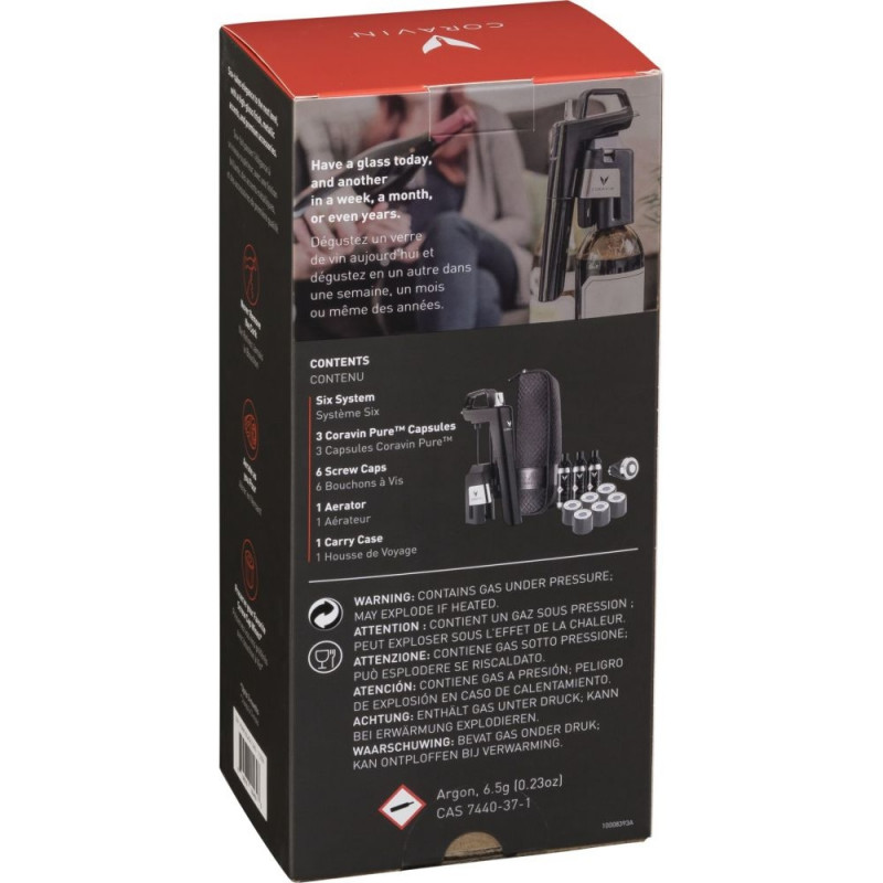 - 1x Timeless-Six wine system, 1x aerator, 6x closures, 3x argon cartridge